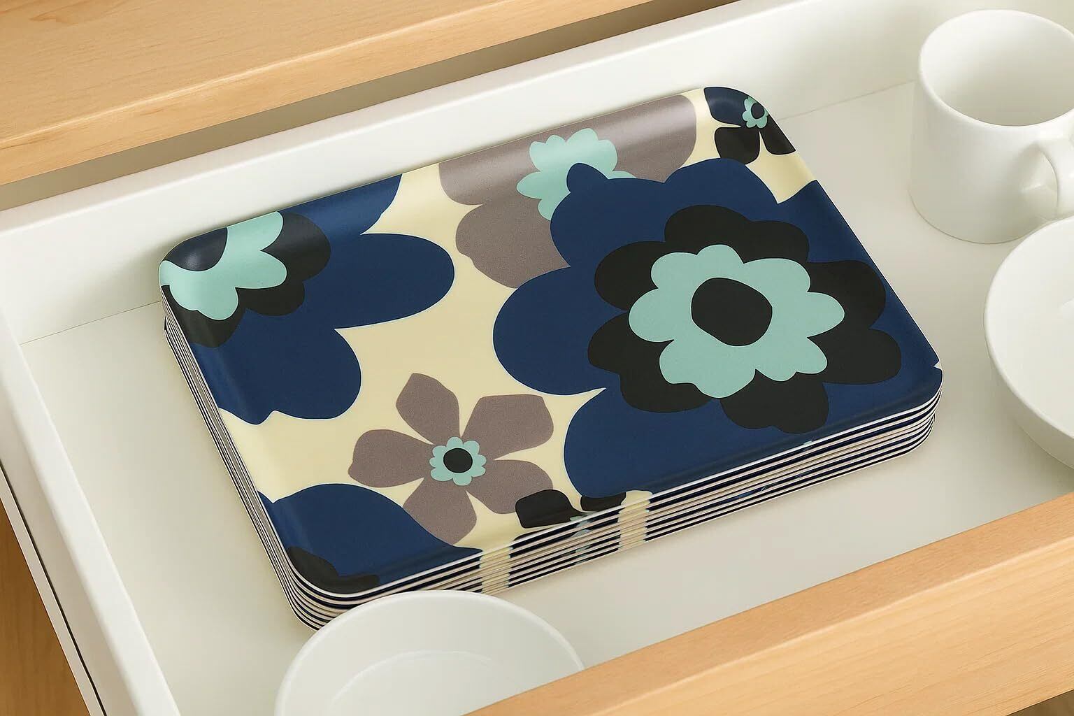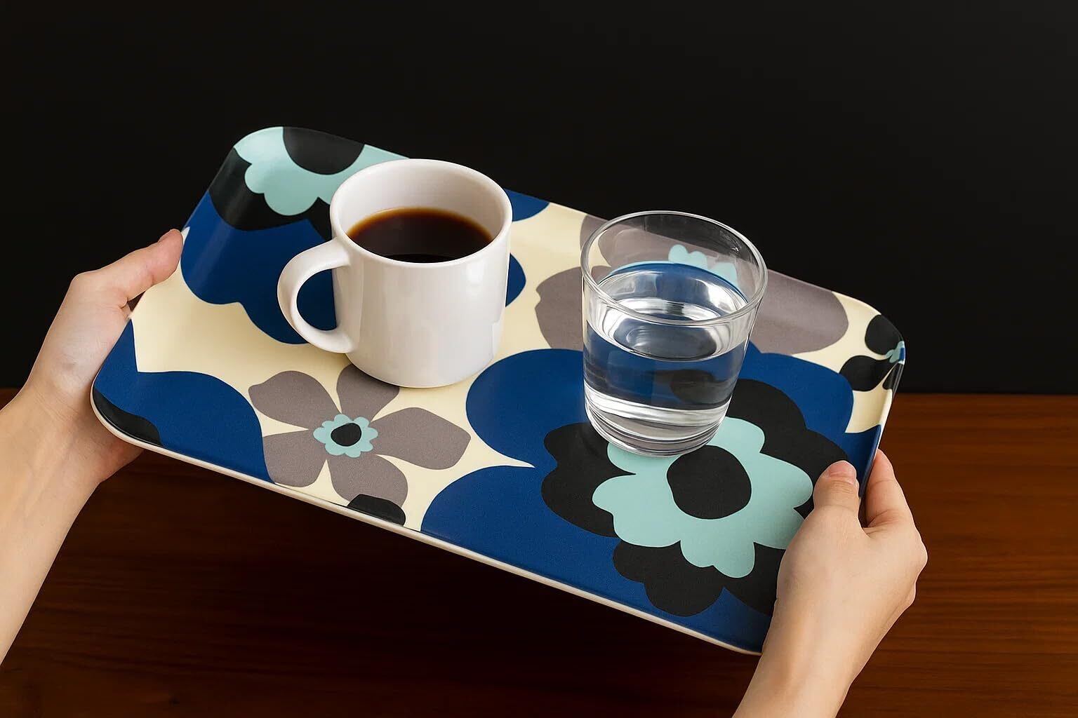 おしゃれ心いっぱいのテキスタイルと、耐水性に優れ、食品衛生法にも合致したリードフリーの安全な樹脂と塗料で作ったテキスタイルトレイ。 ●持ち手部分を省く事により、トレーの隅々まで使えるようにデザインされたスクエアタイプのトレー。トレーとしてだけでは無く、お料理と一緒にレンジで暖めた後はテーブルまで運んでランチョンマットとしてもご利用頂けます。 ●同じ柄の別サイズのトレーもございます。お揃いで揃えればお食事の時間がもっと楽しくなります。 ●テキスタイル(布地)ならでの風合いをそのままに、機能性を追求したトレーです。 ●「日本三大漆器」に数えられる、お盆の産地「紀州漆器(和歌山県海南市)」の技術で作られた、日本製の製品です。