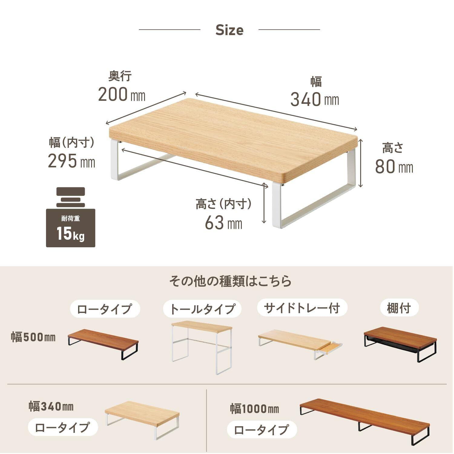 【机上スペースを有効活用】幅34cm×奥行20cmのコンパクトなサイズは、デスク上のスペースを有効に使える設計です。ロータイプのため、ディスプレイやノートパソコンを設置すれば、目線の高さを調整し、快適な作業姿勢をサポートします。耐荷重15kgを実現しているので、安心してお使いいただけます。