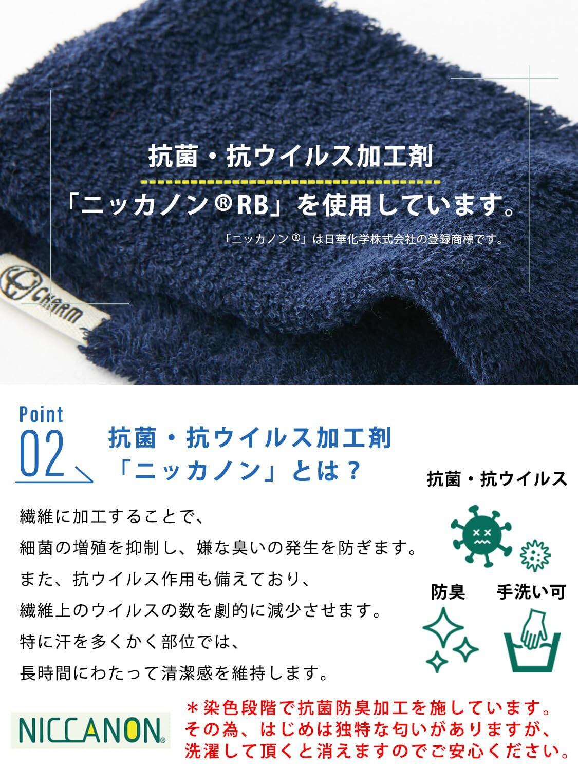 【抗菌防臭加工で安心】パイル地が汗をしっかり吸収し、快適な付け心地をキープ。吸汗性に優れ、抗ウィルス・抗菌防臭加工で臭いや菌の繁殖を抑え、清潔にお使いいただけます。
