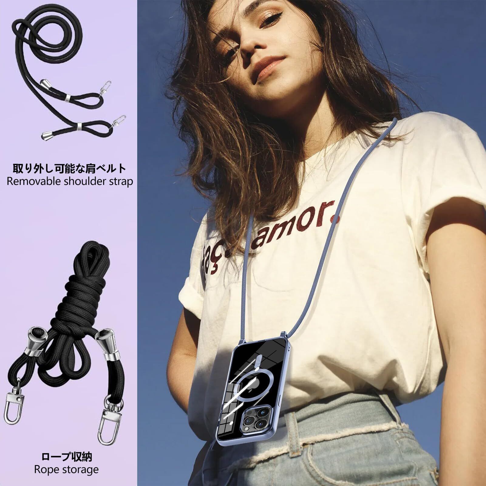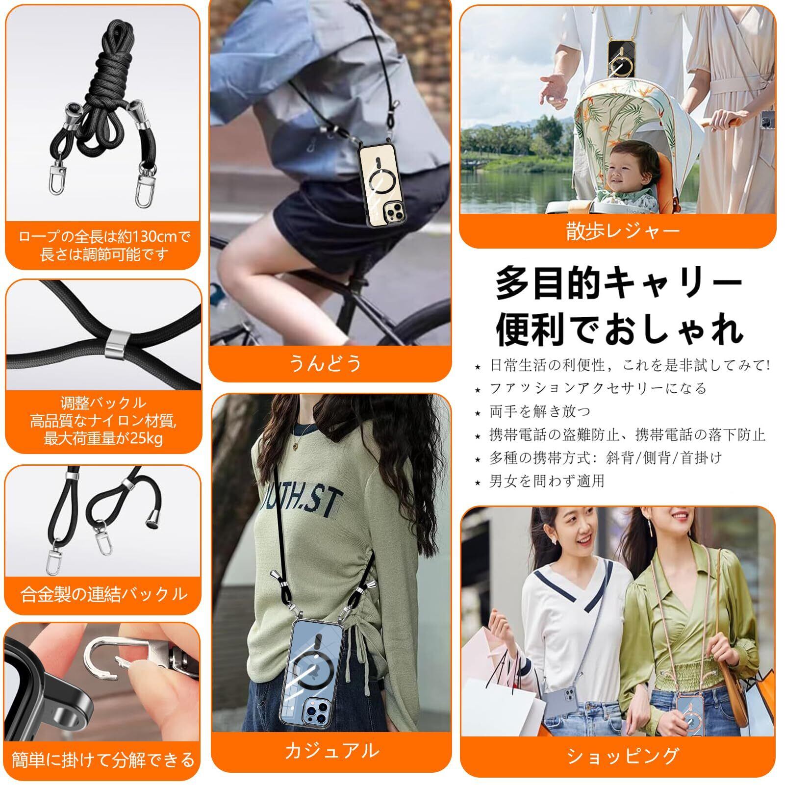 【実用的なストラップ】:携帯ケースに付属のストラップはとても便利です。必要に応じて取り外すことができ、腕や肩にも簡単に掛けられます。ストラップは太くて丈夫なので、安心感があります。長さを調整できるデザインは、とても親切で、腕に短く掛けたい時も、肩に長く掛けたい時も、適切な長さを見つけられ、さまざまな使用シーンに対応できます