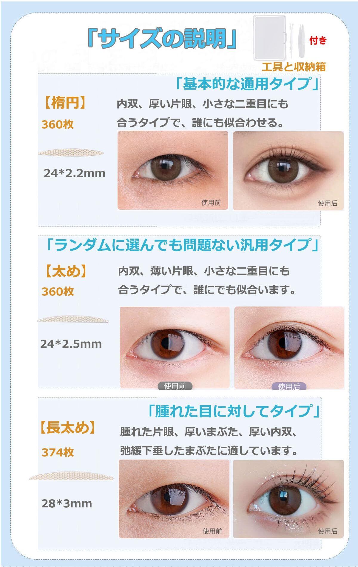 【たっぷり使える360枚の大容量】こちらのパッケージには、なんと約360枚ものテープが入っています!毎日のメイクや特別な日のためにたっぷり使えるので、コストパフォーマンスも優れています。友達とシェアしたり、旅行や外出のお供にも最適です。あなたの美しい目元をサポートします。