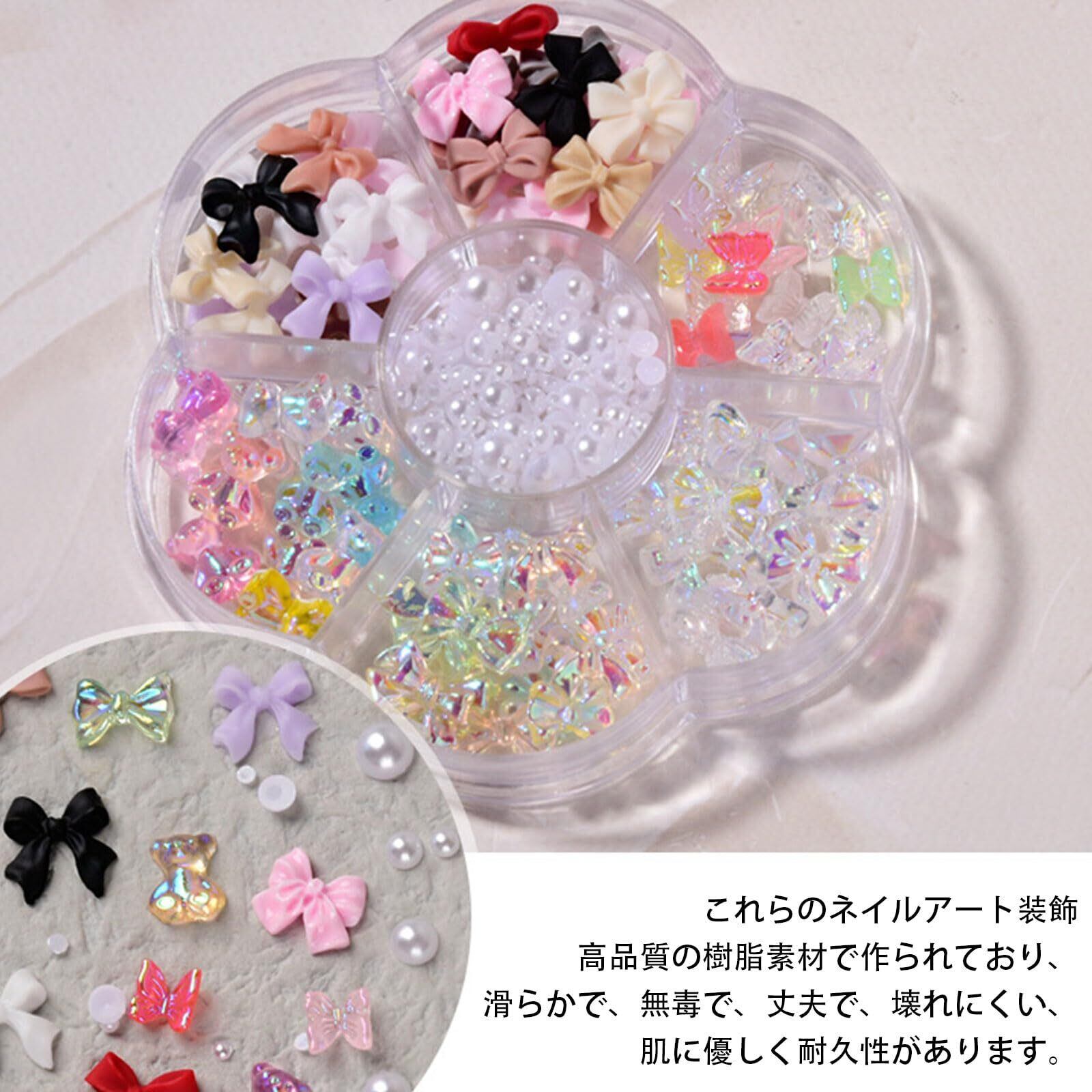 【3Dネイルパーツ】クマ、リボン、蝶々、パールがセットになったネイルパーツです。種類が豊富なネイルパーツは立体感があり、エレガントで上品なネイルを作りたい時に欠かせない。