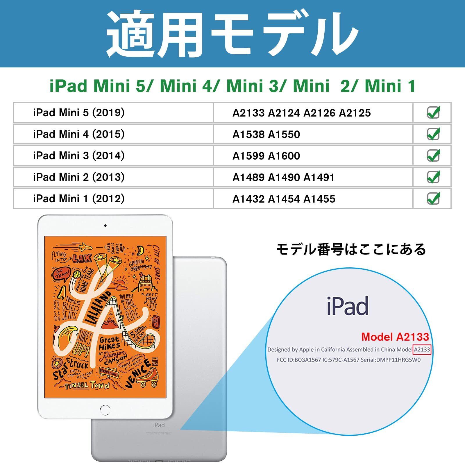 【対応端末】Apple iPad Mini 5 7.9" 2019 (A2133 A2124 A2126 A2125), iPad mini 4(A1538 A1550 A1546), iPad Mini (2012), Mini 2 (2013), Mini 3 (2014) (A1432 A1454 A1455 A1489 A1490 A1491 A1599 A1600);その他の型式に適用されません。購入前、ご設備のモデル番号をご確認いただきます。