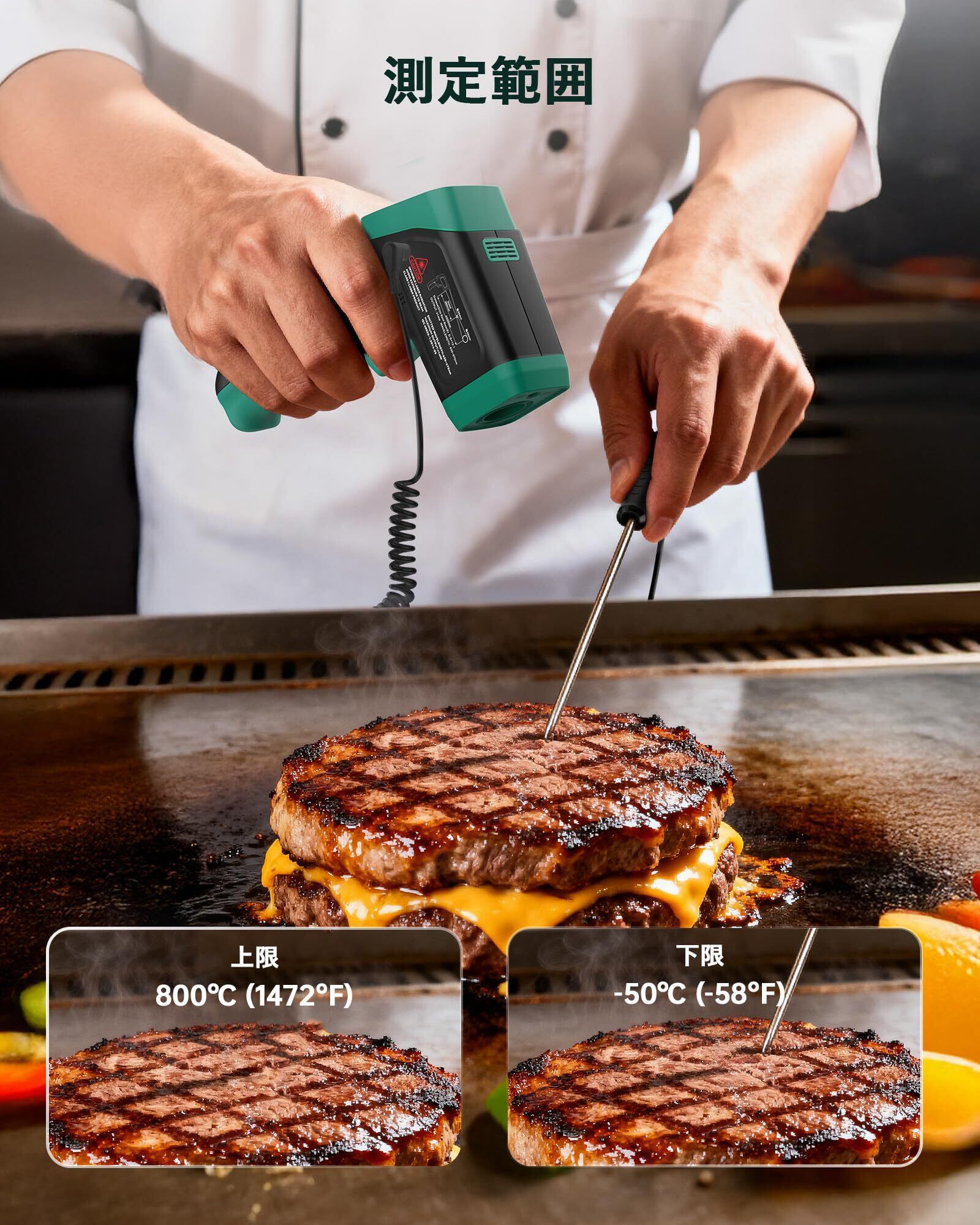 非接触×接触の2WAY測定:赤外線による非接触測定(-50℃~800℃)と、プローブ接触測定(-50℃~300℃)に対応した二合一設計。高温・危険物は非接触で安全に、液体・空気・内部温度は接触で正確に測定でき、1台で幅広い測定シーンをカバーします。