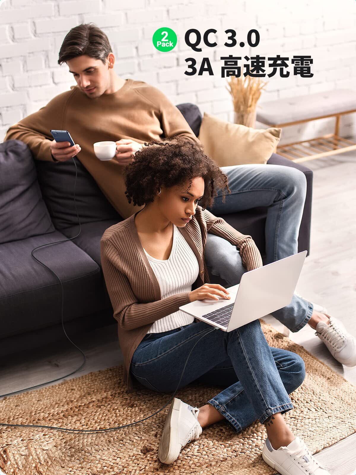 Qualcomm QC 3.0急速充電と同期: 3Aまでの急速充電及び480Mbpsデータ転送を1本でまとめて快適に使うことが出来ます。しかも、2本セットは、一本を家でタブレット用に、一本をスマホで外出用に或は車内/会社/学校とかに不備を補われ、家族一緒にご利用もできるようになります。