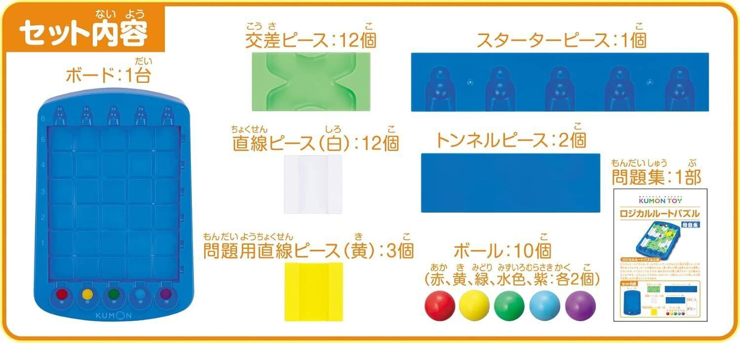 セット内容: ボード1台、交差ピース12個、直線ピース(白)12個、問題用直線ピース(黄)3個、スターターピース1個、トンネルピース2個、ボール10個(赤、黄、緑、水色、紫各2個)、問題集1部