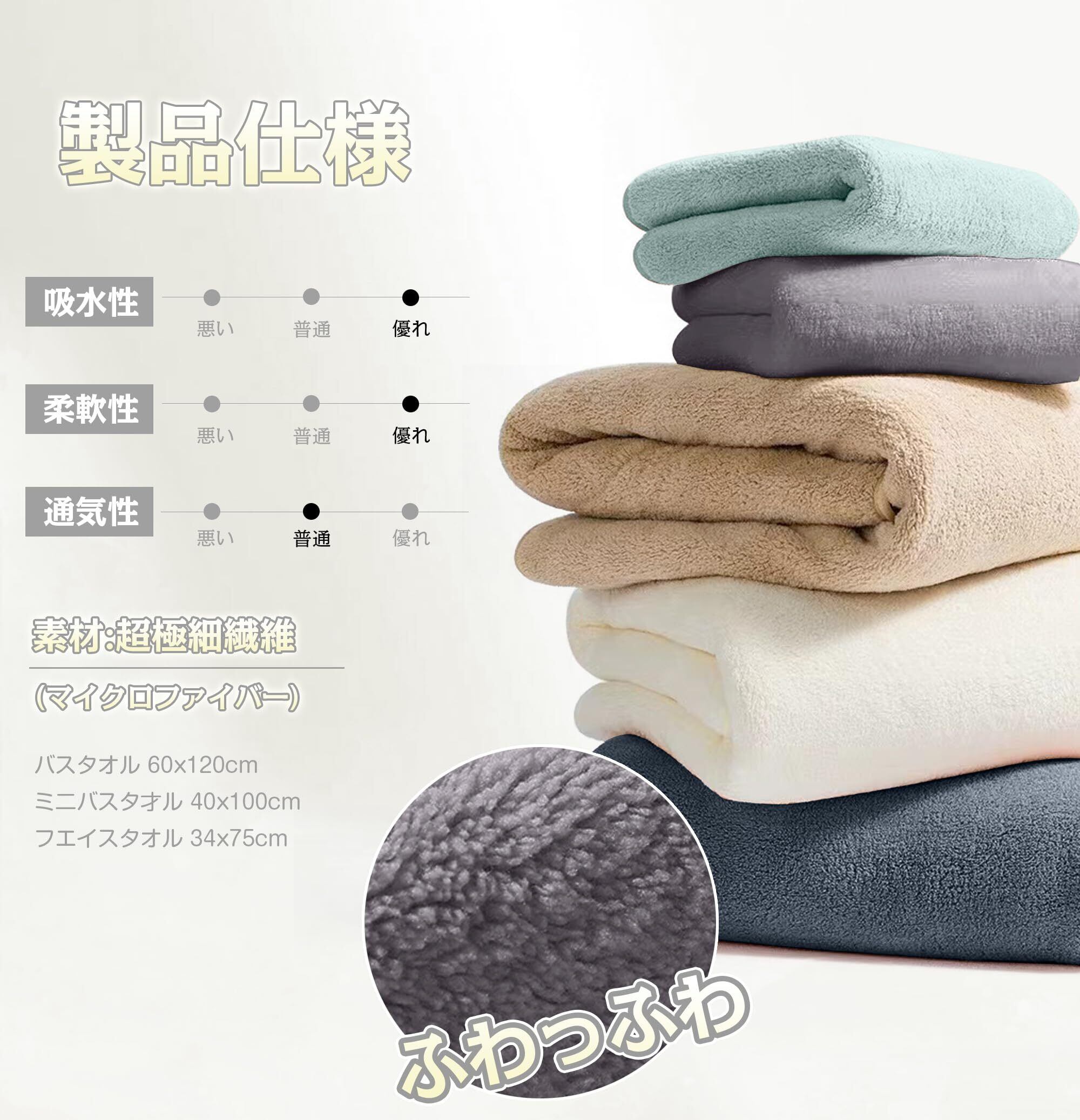 【マイクロファイバー素材】丁寧に織り上げた高品質極細繊維です。一般的なマイクロフアイバ-のタオルと比ベて約2倍以上のボリュ-ムがあり、ふんわりと包み込まれるようなリッチな使い心地。両面ともに厚手なのが機能性がさらにアップです!特徴:吸水速乾、軽量、糸抜け防止、通気性が強い、静電気なし、蛍光なし。想像を超えるふわっふわの触り心地なので、大人だけでなく敏の肌も每日を心地よく包みこみます。
