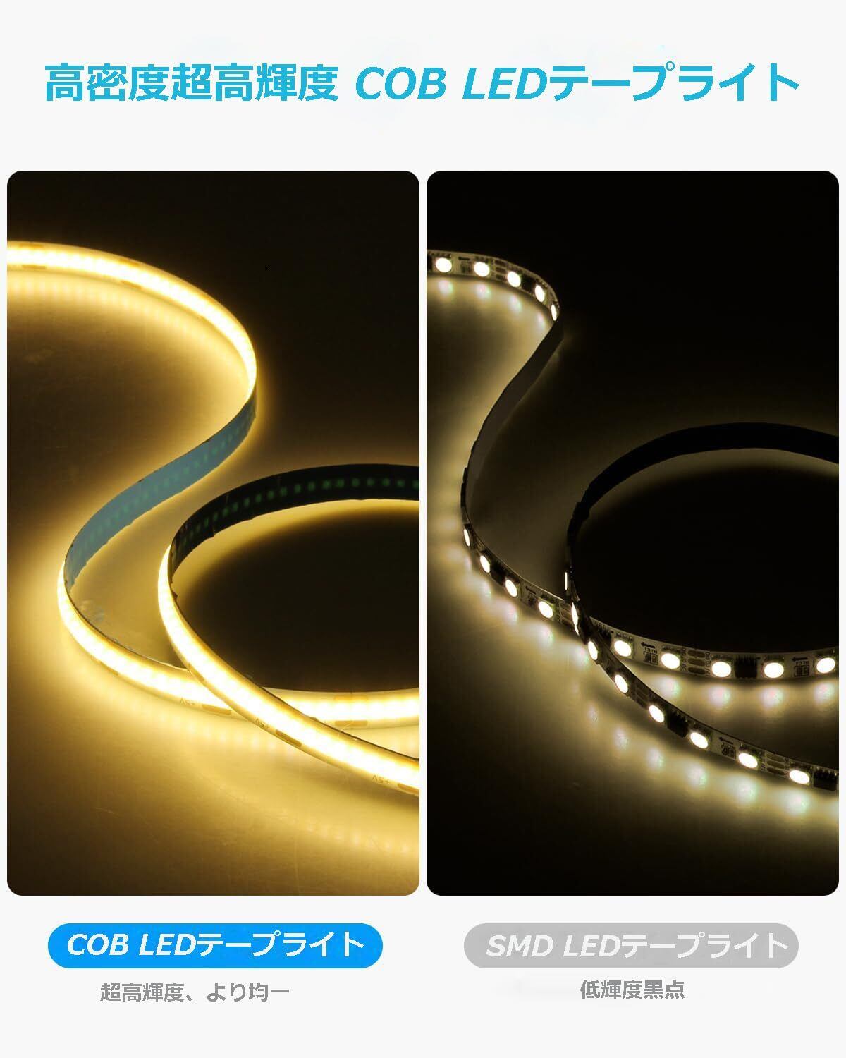 「自由に接続・切断可能」:このCOBテ一 プLED はカットライン(2.5cmごと)に沿ってカットすることができます。 また、貼り付けとカットが可能なため、様々なニーズに合わせて、好きな長さと形を実現する自由度が高いです。最強の粘着剤と8mm幅で、キャビネットの装飾、エッジフック、ワードローブなどの狭い場所にも簡単に取り付けることができます。