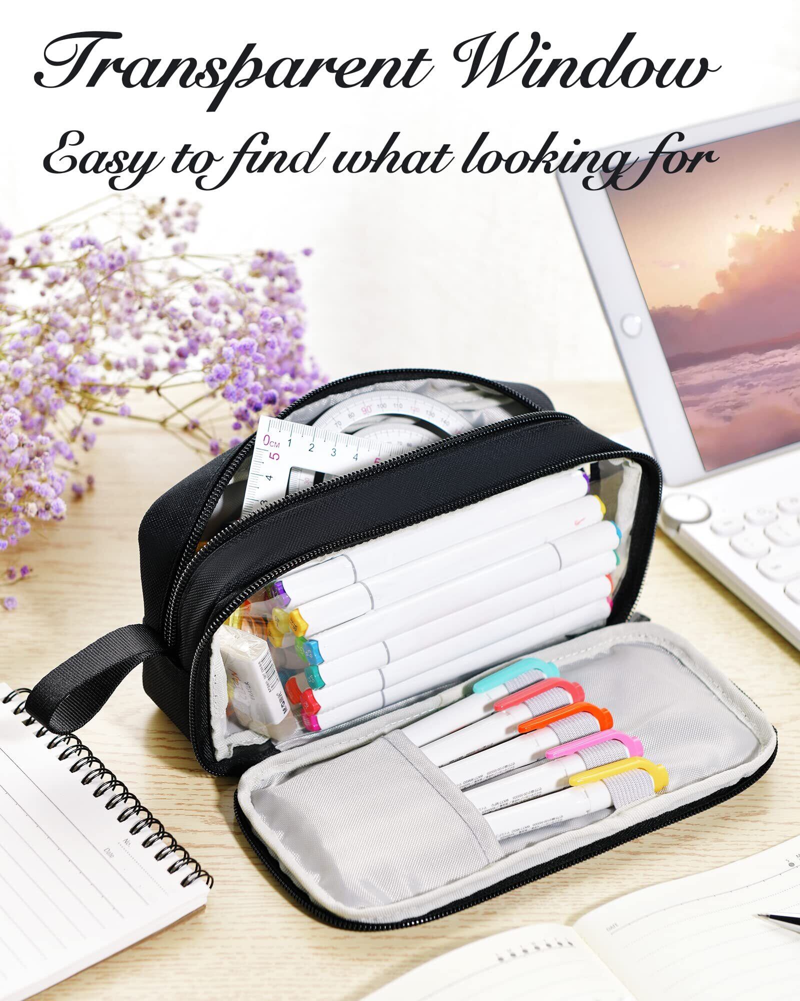 【特価商品】YOKUMA ペンケース 筆箱 ポーチ 透明な窓 クリア ペンポーチ おしゃれ シンプル 大容量 多機能 大人 高校生 中学生 男の子 女の子 大学生 小学生 子供用 (ブラック)