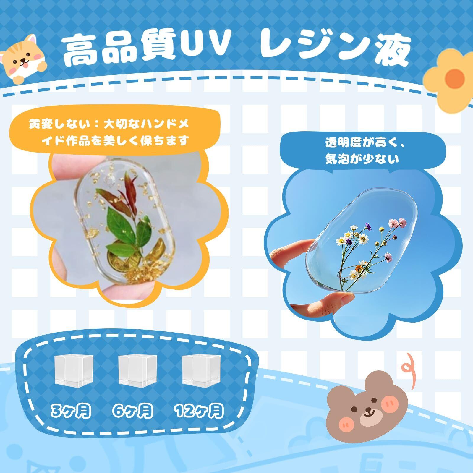 気泡少なく、使いやすい:このUVレジン液は気泡がほとんど発生せず、滑らかな仕上がりが実現できます。適度な粘度により、型に流し込みやすく、作業がスムーズに進みます。ご使用中にご不明な点がございましたら、いつでもお気軽にお問い合わせください。ご購入後も安心してお使いいただけるよう、お客様のご満足を第一に、丁寧なサポートを心がけております。