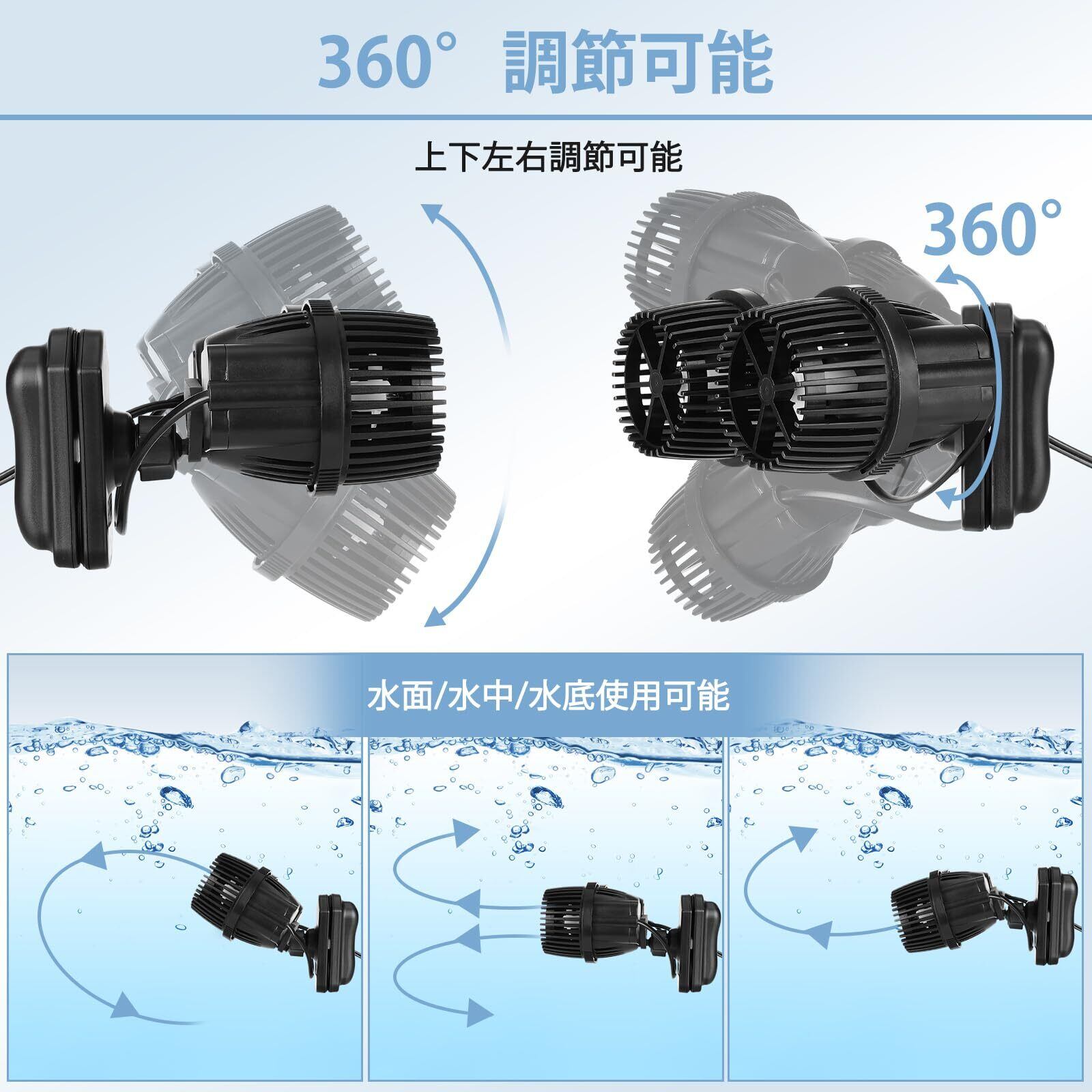 【広範囲水流】水流ポンプは二重出口設計で、水流の効果が2倍になり、水の波がより長く、より広く、より強力になります。上下左右360°調節可能なボールジョイントを採用し、水平方向の広角面がより広く、水波が広範囲に到達できます。