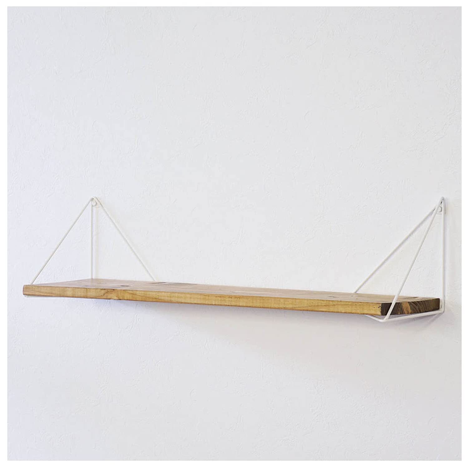 市販の1×8材、幅200mmのパイン材どちらにも対応。自分の好みの材質、サイズの棚をDIYで作れるトライアングルフレームです。壁を大きく傷つけず、石膏ボードにも付属の専用ピンで固定OK。