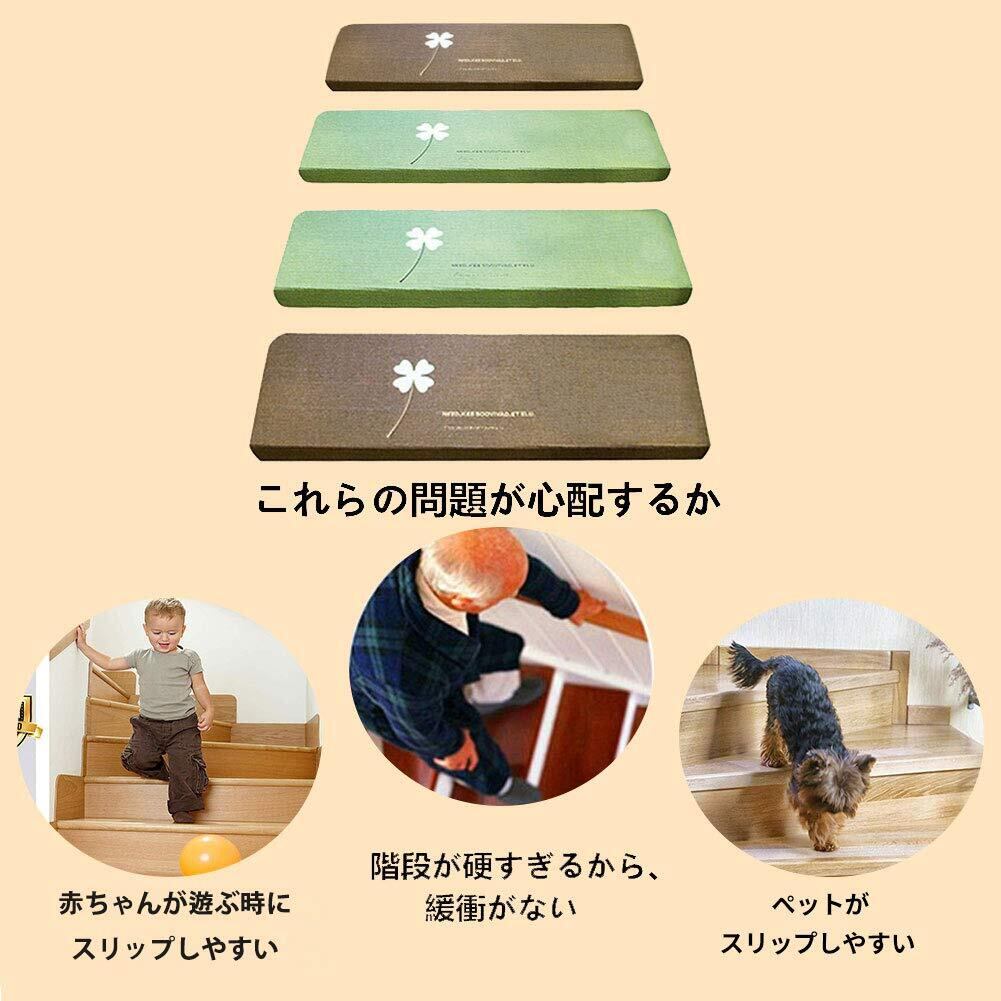 【安全性を追求した階段マット!】こちらの【MINIU 階段マット】は、滑り止め機能を備えたデザインが特徴です。うっかりした転倒を防ぎ、家庭やオフィスなどで安心して歩行ができる環境を提供します。緑の四つ葉デザインが、お部屋にも明るく彩りを添えます!