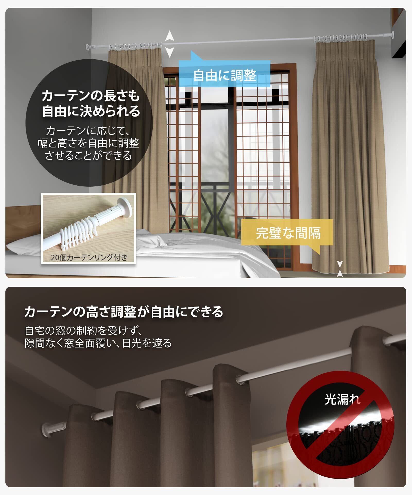 【収納力アップ・省スペース】つっぱり棒は自由に長さが調節でき、どこにでも設置でき、狭いスペースはもちろん、家の中のデッドスペースにも使えます。例えば:洗濯物を室内で干す、廊下でも部屋干し、ベランダの外に干す、つっぱり棒、クローゼットロッド、浴室用タオル掛け、室内用カーテンロッド、シャワーカーテンロッド、布団干し、物干し竿、キッチン用品収納。