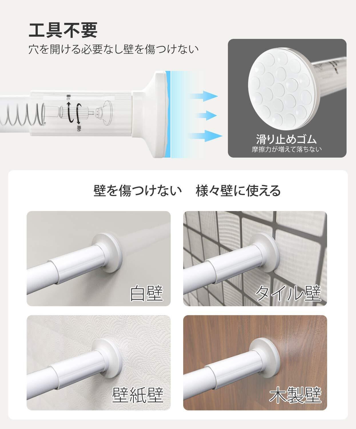 【耐荷重抜群】つっぱり棒は炭素鋼製で、強い負荷に耐えられます。强力ばねを内蔵して、長く伸ばしてもずれ落ちる心配がないです。接着面が滑り止めゴムを採用するので、摩擦力が增えます。