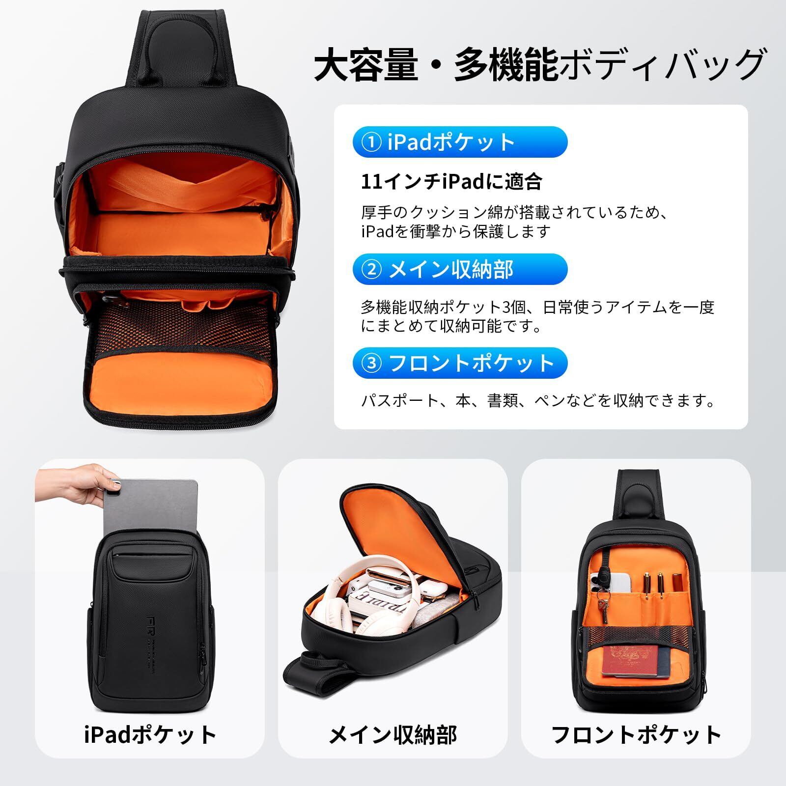 [FENRUIEN] ショルダーバッグ [18L] 大容量 ボディバッグ かたがけかばん USBポート付き 11インチiPad収納可能 防水 耐久性 多機能 肩掛 男性 多層収納 斜めがけバッグ