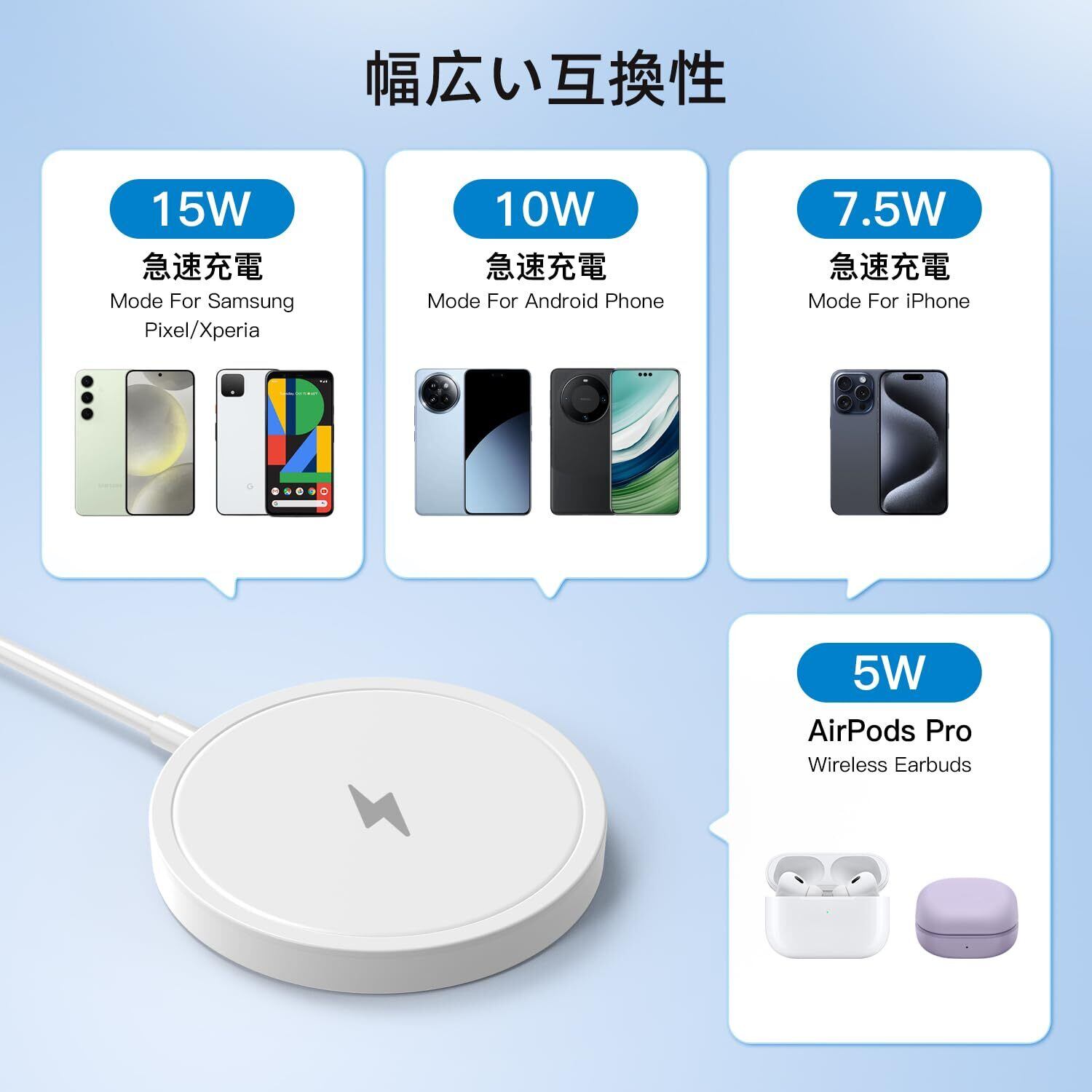 Galaxy S24 / S23 / S22 / S21 / S20 / S10 / S9 / S8 シリーズ, Pixel 8 / 7 / 6 / 5 シリーズ, Xperia 1 V / IV / III / II シリーズ, iPhone 12/13/14/15/16 シリーズ, 全てのQi対応機種
