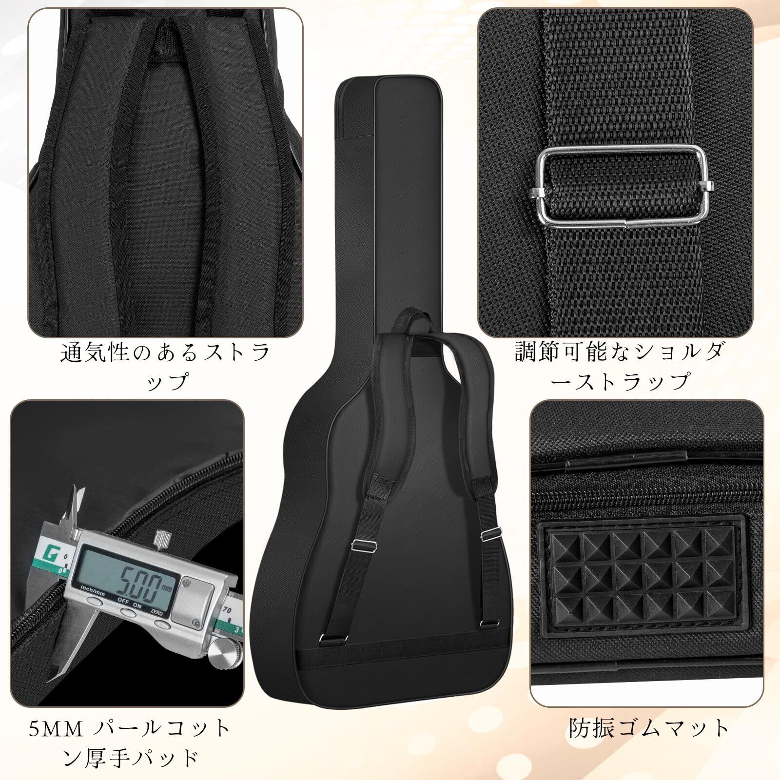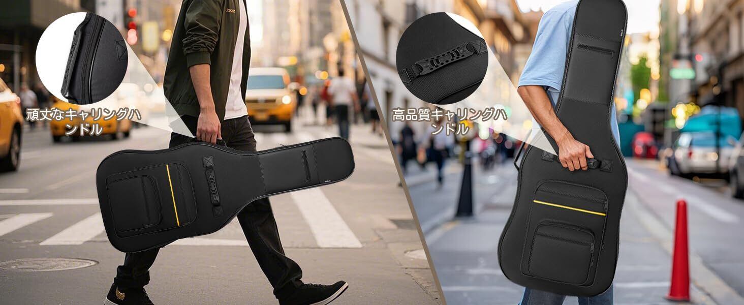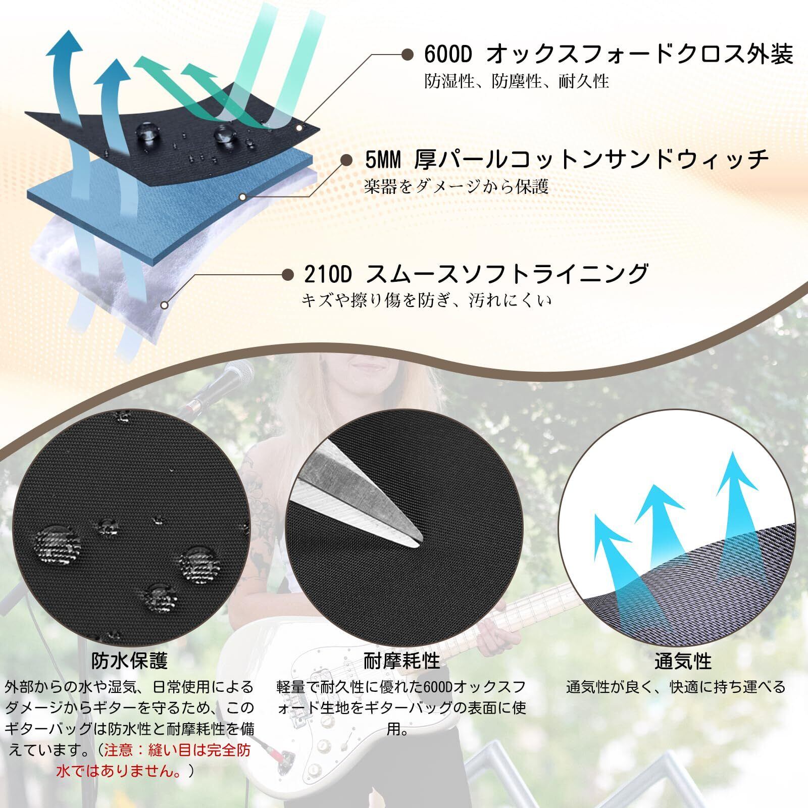 【防水性・保護性】楽器を水や湿気、日常使用による損傷から守るために、このギターバッグは防水性と耐摩耗性を持っています。(注意:縫い目は完全防水ではありません)壁に立てかけて倒れないように、バッグの底部には滑りにくい高品質PP素材のゴムが使用されています。中間層には5mmの衝撃吸収パールウールが使用されており、輸送中の傷や摩耗を効果的に軽減します。