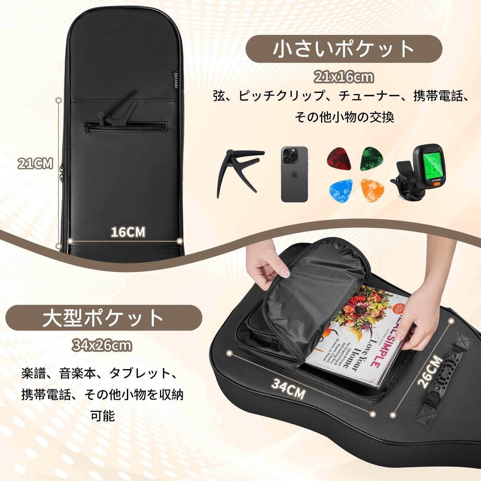 【多彩な収納機能!大容量6ポケット】大容量の収納ポケットを6つ装備しており、弦やステッカー、チューナーなどの小物をスッキリ収納できます。楽器本体だけでなく、必要なアイテムを一緒に持ち運べるので、演奏の準備もスムーズです。