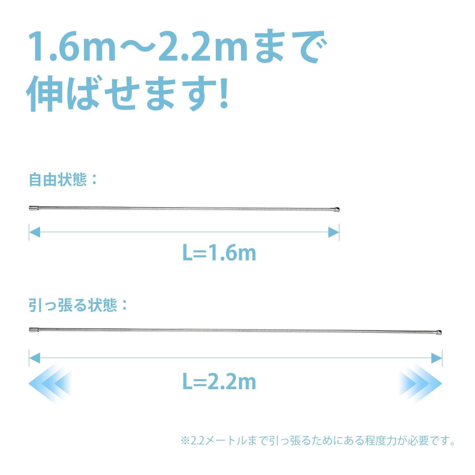 [自由伸縮] ホース長さは1.6m~2.2mの範囲内で調節できます。自由状態の長さは1.6mであり、ご希望に応じて2.2mまで伸ばせます。ホースが自由状態になると、また1.6mに戻ります。(伸ばすことにある程度の力が必要です。両側の金具を含めて、ホース全長2.2メートルまで伸ばせます。)