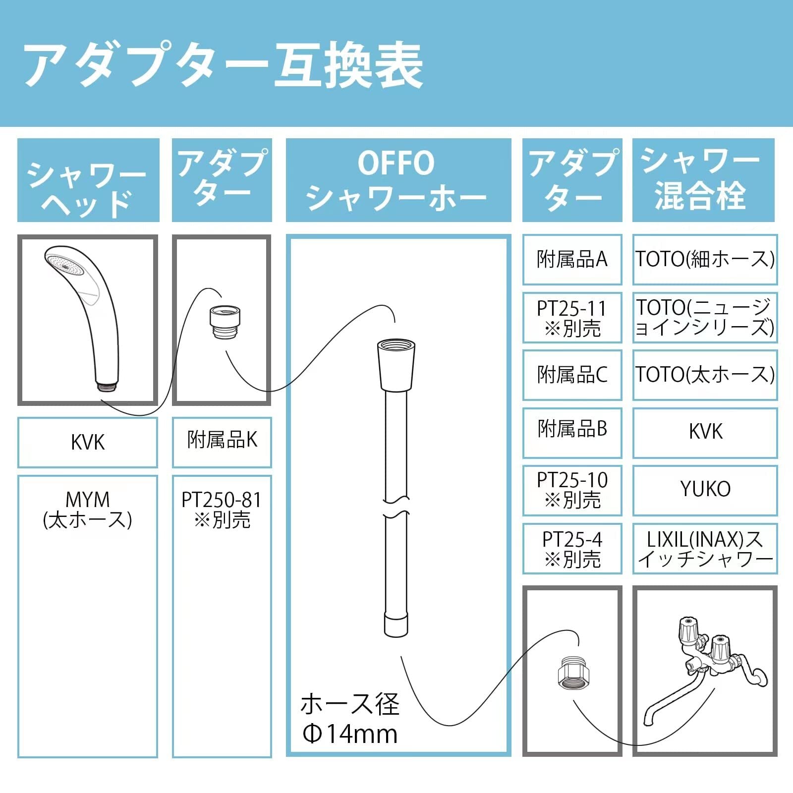 [適用する混合栓] 本品と混合栓を接続する側のネジサイズはG1/2です。本品はLIXIL(INAX),SAN-EI,MYMの混合栓にそのまま取付けできます。※LIXIL(INAX)バランス釜、ツーバブルシャワー混合栓、スイッチシャワー混合栓は接続できません。TOTO大口径混合栓、TOTO細ホース、KVK水栓は付属のA,B,Cアダプターを使えば接続できます。