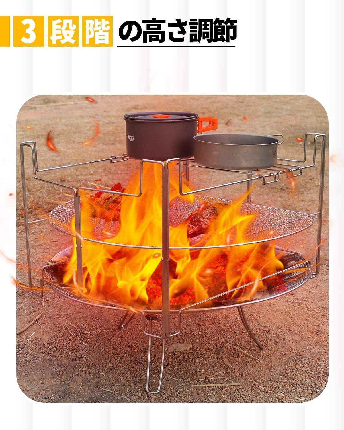【3段階の火加減調整で自由自在!】焚火や調理に応じて、簡単に火加減を調整できる3段階の機能付き。焼き具合や温度管理がしやすく、料理の幅も広がります。焚火をしながら、思う存分に美味しい料理を楽しんでください!