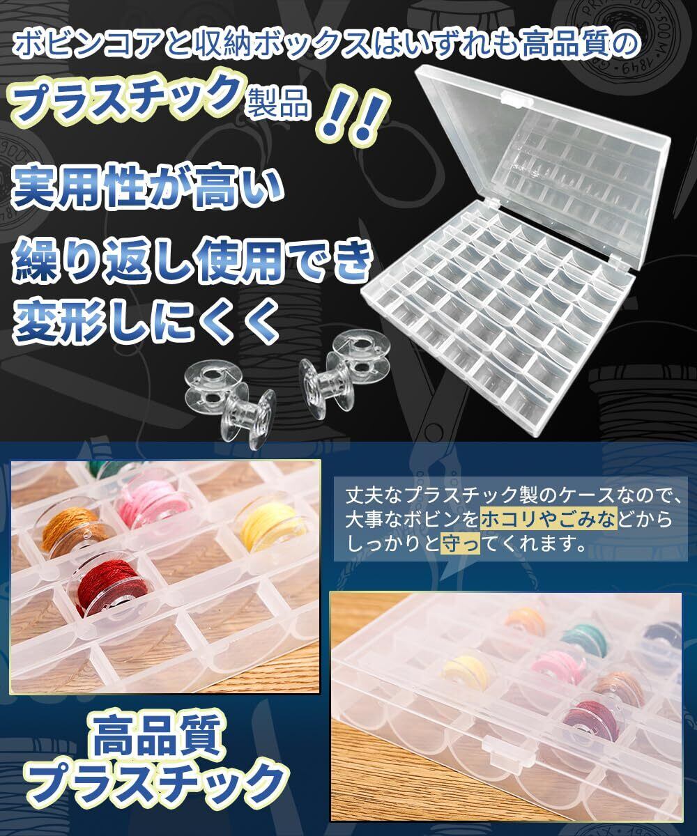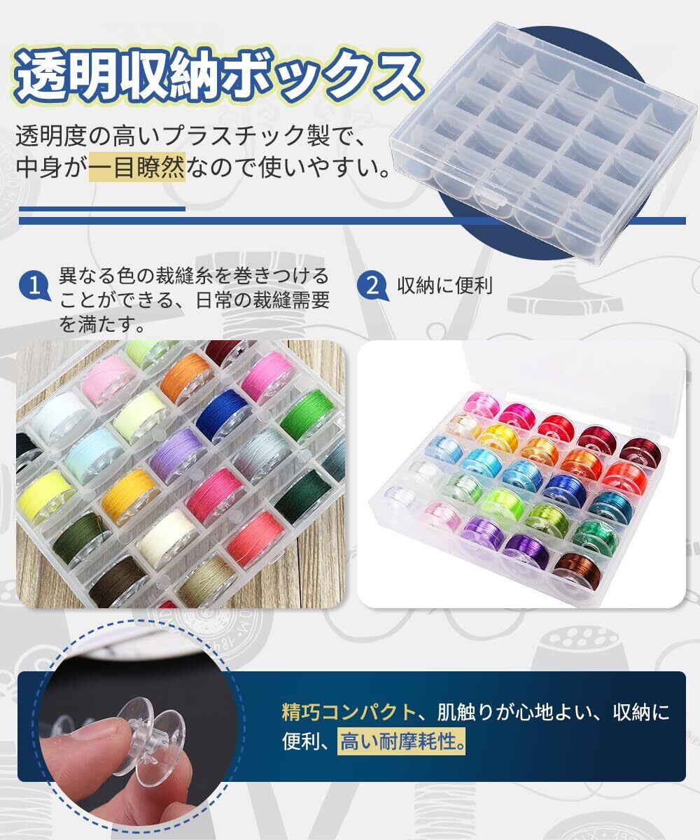 【収納に便利】異なる色の裁縫糸を巻きつけることができる、日常の裁縫需要を満たす。透明なプラスチック製の高品質ケースが付いています。1箱に36本のボビンが入る。各机種各仕様のボビンの収納に適しています!