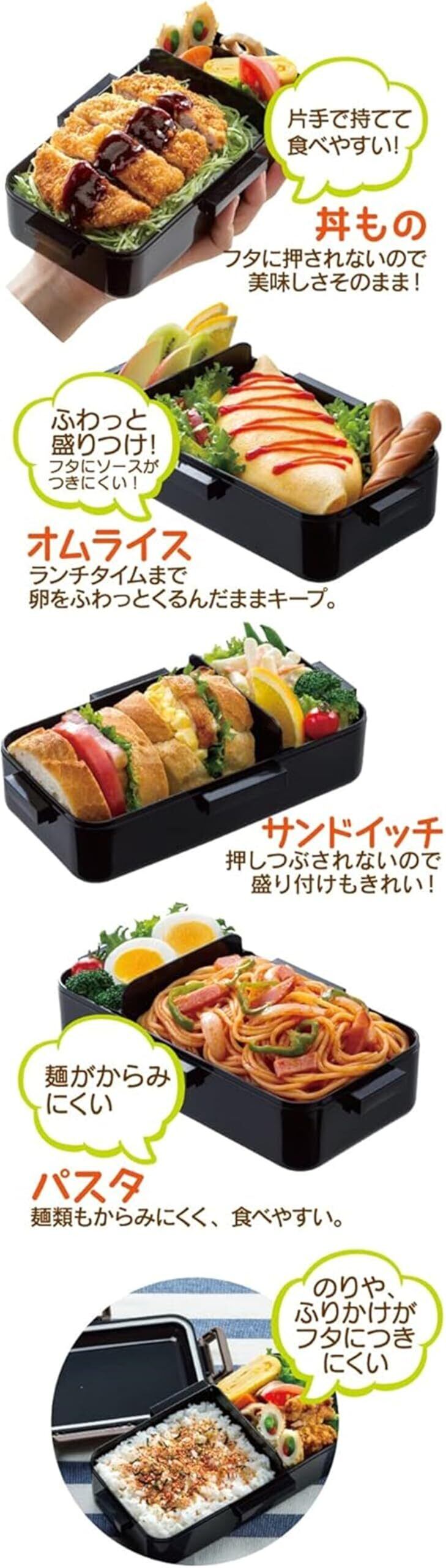 【ふんわり盛れるドーム型フタで料理が映える!】ドーム型のフタは、食材をふんわり盛り付けることができ、見た目にも華やかなお弁当を実現します。ランチタイムに食欲をそそる美しい盛り付けができるのも大きな魅力です。ブラックのデザインはシンプルでありながら洗練されており、男女問わずご使用いただけます。