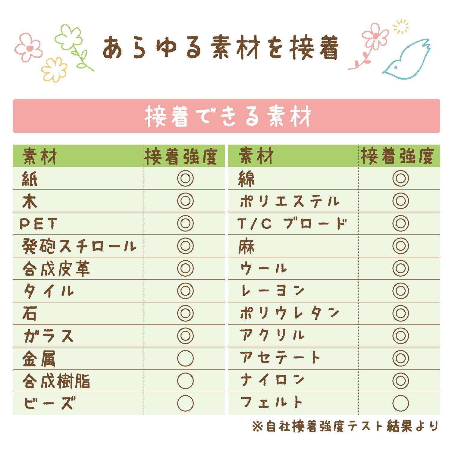 布、紙を使った手芸や工作に最適。ズボン、スカートのすそ上げやコサージュ、ヘアアクセ、ピアス等の小物・アクセサリー作りに。木材、チャームやタイル等を使ったDIYに。