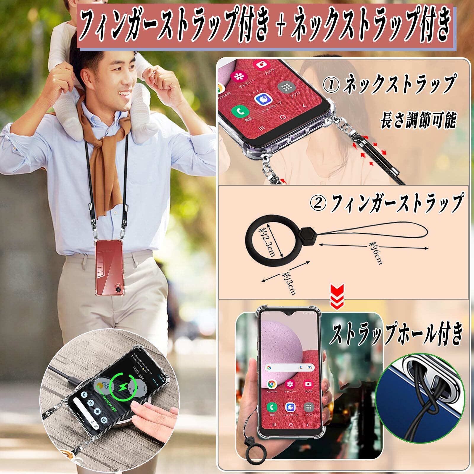 【携帯Galaxy A23 5G ケースストラップ2枚付き & 両手解放】本Galaxy A23 5Gケースにはフィンガーストラップとネックストラップが付属します、このネックストラップは、ボタンを押すと、カチッと外せて取り外しが簡単です。急な着信、メールやネット使用時、スマホやデジカメで撮影したいとき、改札でICカードをタッチしたい時などもネックストラップの煩わしさを感じずに、ストレスフリーに使えます。実験により、ストラップは、約15KG(約200個のiPhone Plusの重量)の引く力に耐えらます (あなたは受け取るでしょう:1x Galaxy A23 5G用ケース + 1xフィンガーストラップ + 1xネックストラップ)