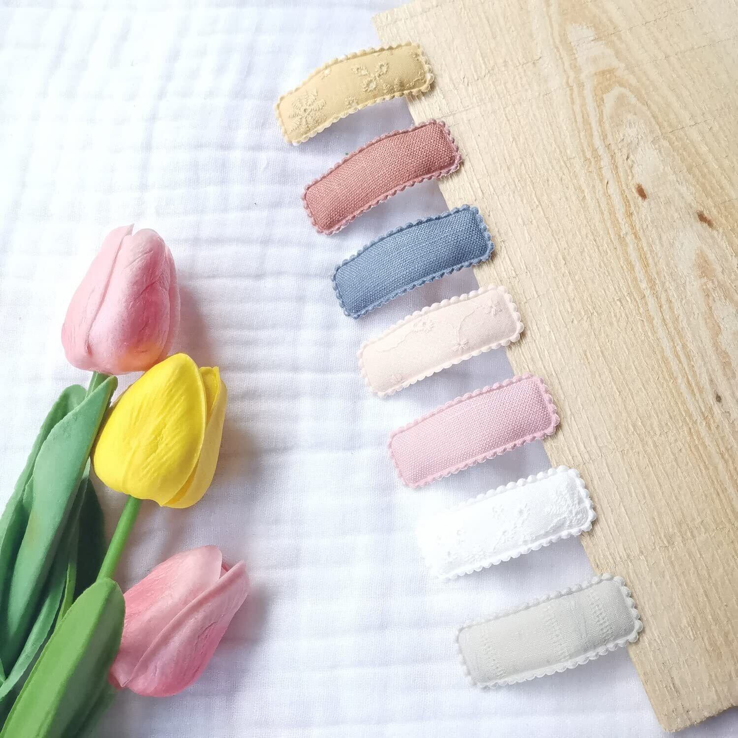 【かわいい子供のヘアクリップ】カラフルで。リネンとかわいい刺繍のリボンヘアクリップ20つセットです。色違いの刺繍で止められたリヘアピンとってもキュート!ワンポイントとして1つでつけても、たくさんでつけても存在感があってとても可愛いです。