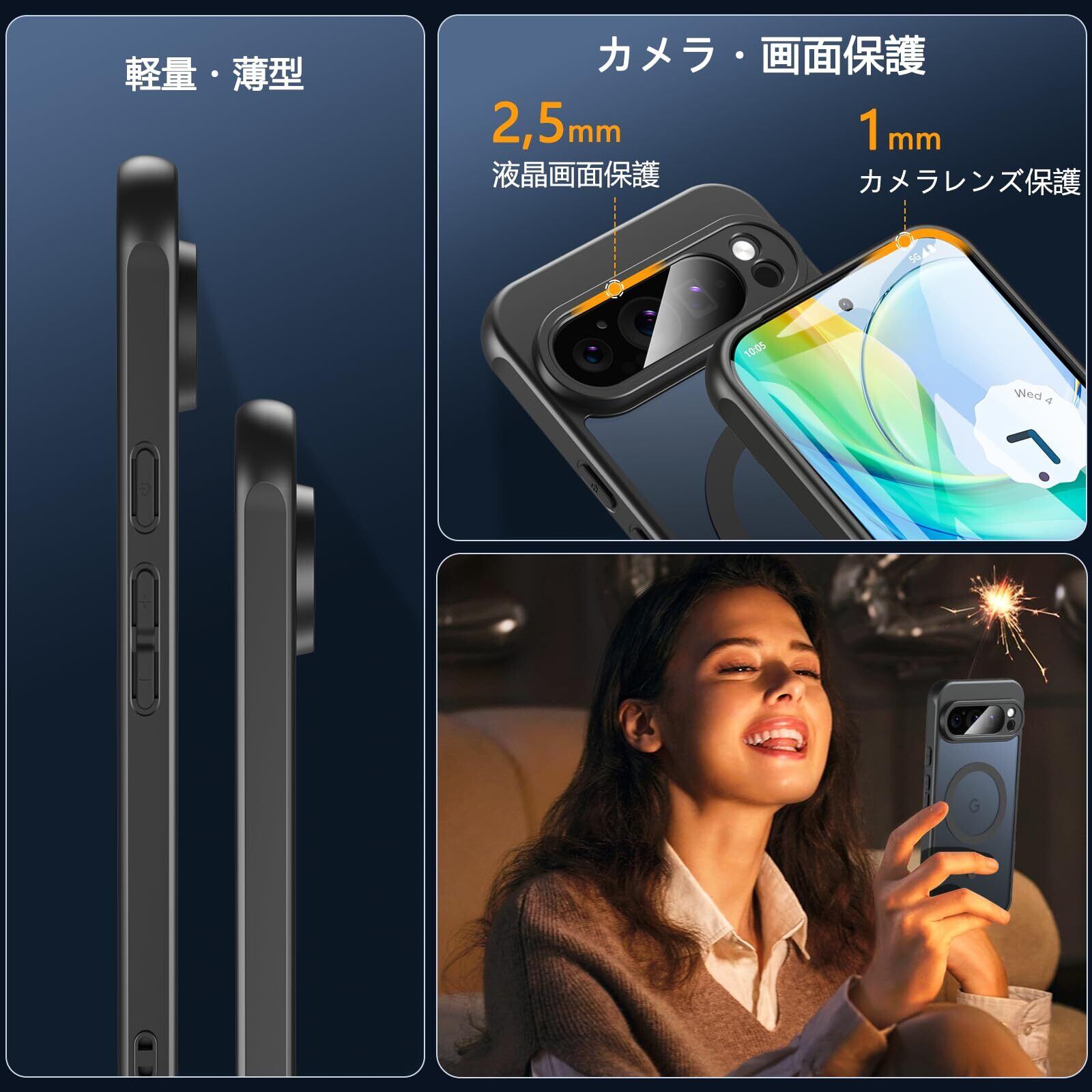 【MagSafe対応・より便利】最新型の強力なマグネット搭載で差し込みのいらない超簡単充電を実現し、吸着力、安定性に優れ、いつでもどこでもワイヤレス高速充電を体験できます。また、MagSafeバッテリー、MagSafeカードケース、MagSafeワイヤレス充電器、MagSafeリング、MagSafe車載ホルダーなど、MagSafeを使用するシーンに対応した Google Pixel 9 Pro XL ケース なので、Magsafeの便利さを満喫しましょう!