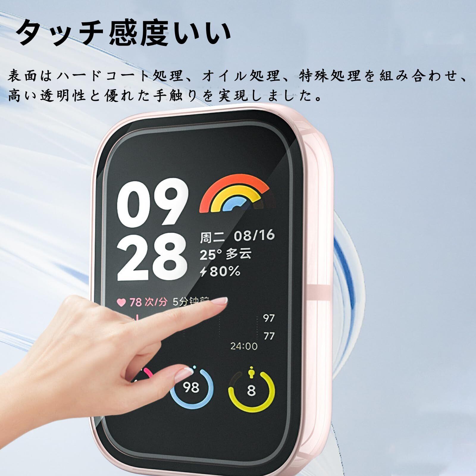 高感度タッチセンサー:高透明度の日本製ガラス+厚さ約1.3mm、重さ2.13gの極薄軽量なPC枠+[シャオミ]Xiaomi Band 8 Proに基づいての革新な一体感設計、バンド部分との干渉もなく、保護ケースを装着したまま充電出来とても便利です。