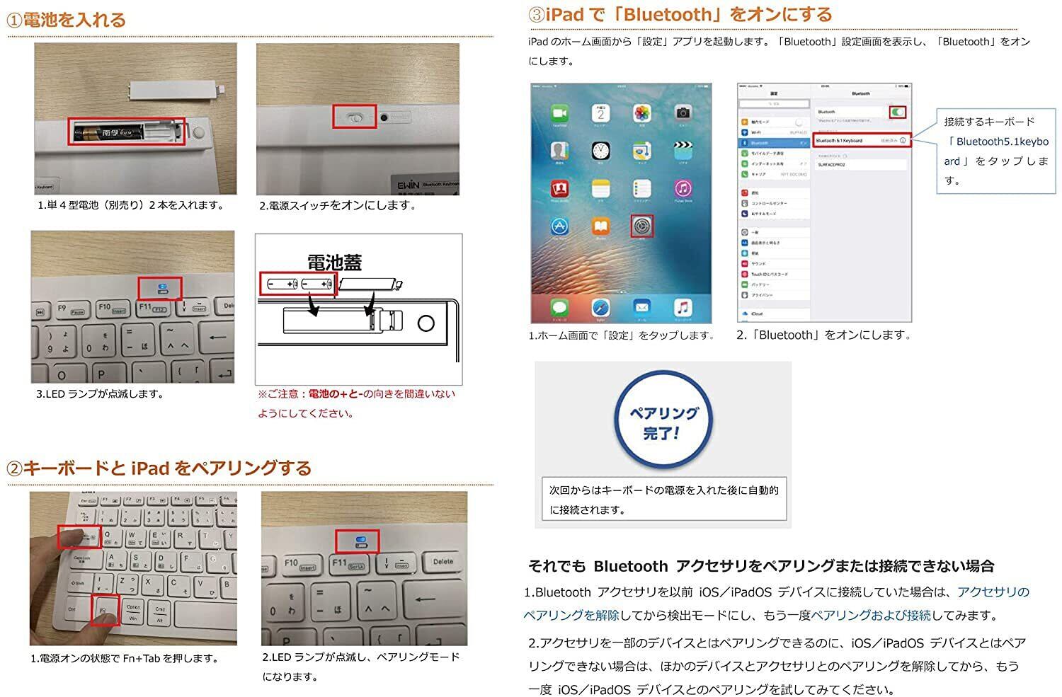 【電池式キーボードとUSB充電式マウス】bluetooth キーボードは外出先での使用にも安心な電池式です。 マウスは乾電池不要、付属のUSBケーブルで簡単に充電できます。一回のフル充電は、最大3ヶ月ぐらい使用できます。 また、充電しながら有線のマウスとしても使用できます。無駄の電池消耗を防止ために、省エネスリープモードが搭載されており、長時間使用しないとき、スマートスリープモードに入ります。 ※電池は付属していませんので、別途ご購入お願い致します。