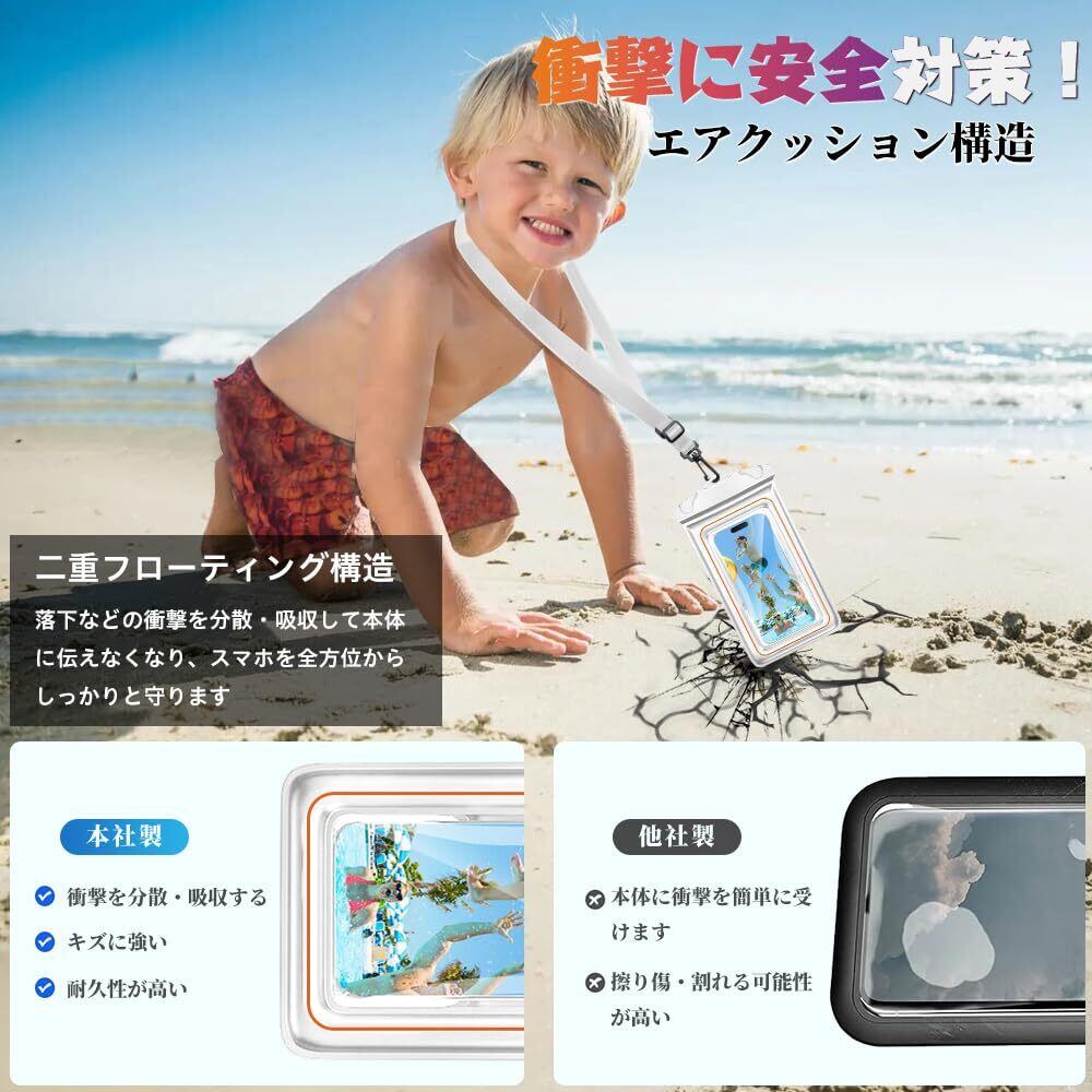 ❀【紛失・衝撃に安全対策!スポンジ素材で浮遊感抜群】従来品と違って弊社の携帯防水ケースは最新改良の側面浮き輪デザインを採用し紛失対策&耐衝撃性&浮力がアップ!通常の防水カバーよりも耐衝撃性に優れています。フローティング構造が落下などの衝撃を分散・吸収して本体に伝えなくなり、高い耐衝撃性を誇り、スマホを全方位からしっかりと守ります。または背面に水に浮くふわふわの「スポンジ」設計を搭載して、浮力がより向上し、水中に沈むことを心配することはないです。市販の普通浮き防水ケースの約2倍と強力!※本製品の浮力受容範囲は約400gくらいです。 受容範囲を超えると沈む可能性があるため、ご使用前にご確認をお願いします。※水中の場合に、水圧のためタッチパネル操作に影響を与える可能性があるので、物理的なボタンを使うことをお勧めします。