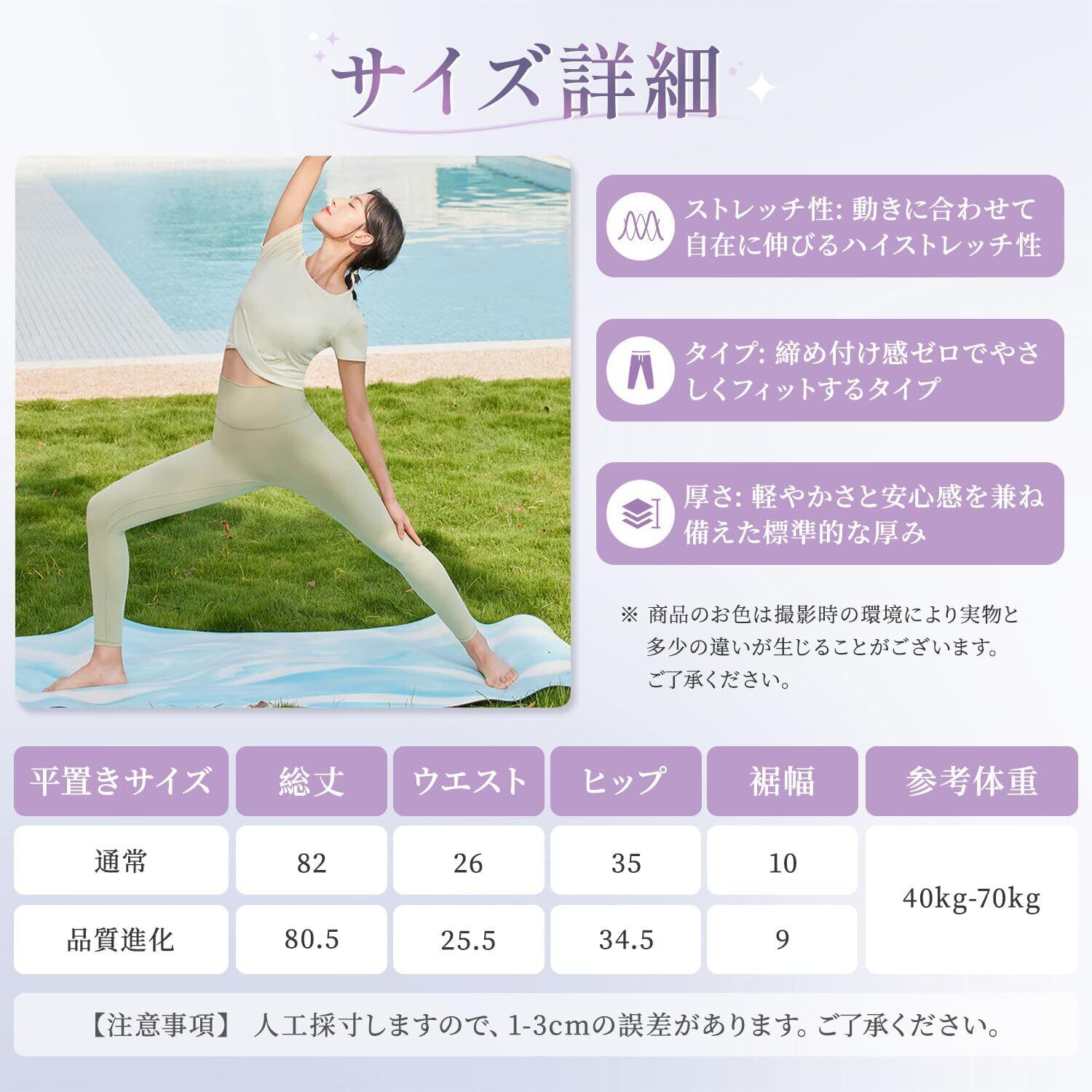 【フリーサイズ】体型・年齢も不問、コレ1本で40kgから70kgまでカバーする驚異のワンサイズ レギンスです。体の動きに合わせてスムーズに伸縮するため、ポーズをとる際も快適に過ごせます。 ヨガ以外のスポーツシーンでも重宝します。