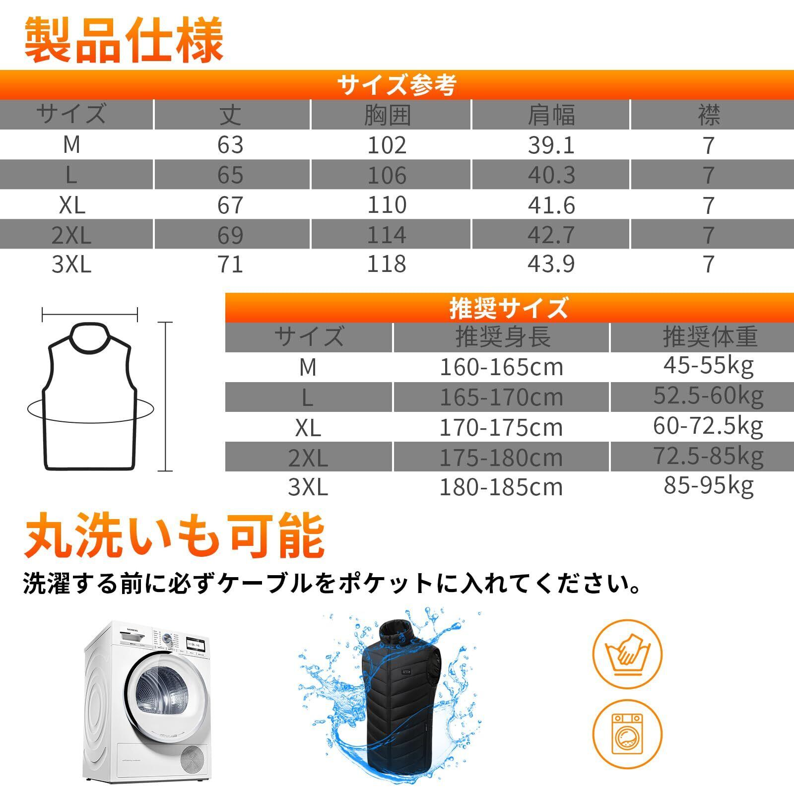 【男女兼用&洗濯可能】10秒で急速に発熱する使い勝手のよさと、高品質の保温材料を使った優れた保温性能で、男女問わず使えます。ヒーターベスト本体は約400gという超軽量で、ファッションも思いのまま。バッテリープラグにキャップが付いて、手洗いも洗濯機でも洗うことが可能で、いつも清潔に保つことができます。