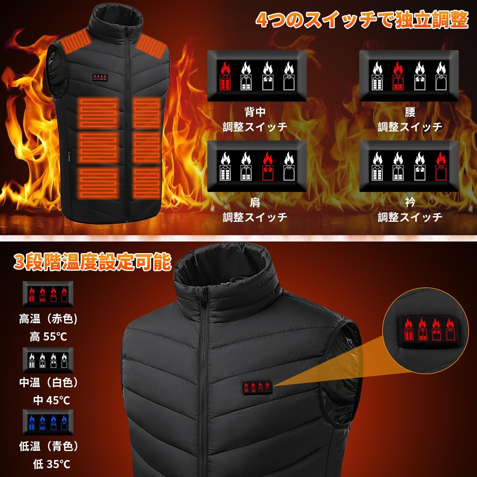 【4つ独立制御ボタン】4つのスイッチが搭載された独立温度設定可能、背中、腰、肩、衿の4ヵ所でそれぞれ個別に電源のオンオフ&温度調節をすることが可能です。シーンに合わせて背中、腰、肩、衿の好きな部分をあたためられます。薄くて軽量なのもうれしいポイントです。