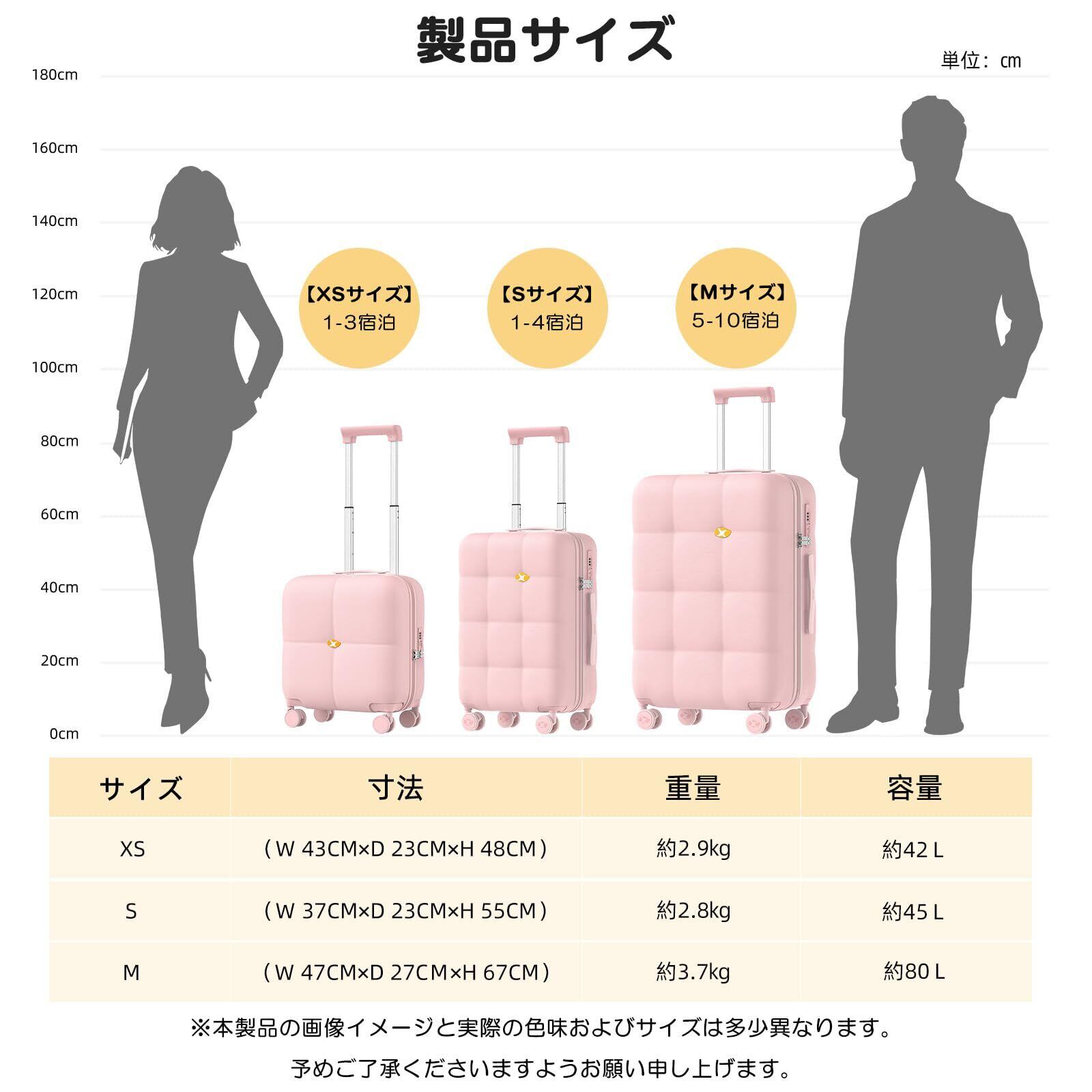【商品仕様】※【SSサイズ】43×23×48cm、三辺合計:114cm、 本体重量:約2.9KG 、容量:42L/1~3泊向き。 ※【Sサイズ】37×23×55cm、三辺合計:115cm、 本体重量:約2.8KG 、容量:45L/1~4泊向き。Sサイズは機内持込が可能なスーツケースです。飛行機内だけでなく、一人旅行や故郷帰りの新幹線やバスなどの車内移動も便利なスーツケースです。※【Mサイズ】47×27×67cm、本体重量:約3.7KG 、容量:80L/5~10泊向き、無料受託可能(158cm以下)**測定方法により2-3cmの誤差がありますので、予めご了承ください。