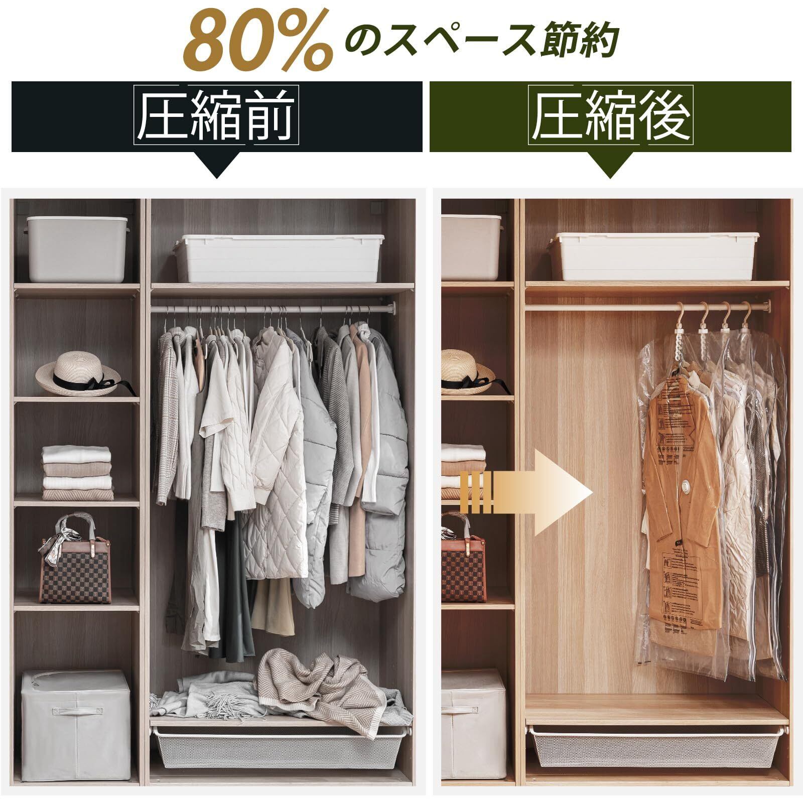 使いやすい:5フック設計により、1枚のバッグに男女問わず5着のジャケットを収納できます。ドレスやオーバーコートも収納できます。圧縮袋にはダブルカラージッパーを採用し、スライダを装備し、ファスナーのシールを容易にし、色の変化によりファスナーが完全にシールされているかどうかを迅速に検査することができます。※使用方法は、まず、収納したいものを圧縮袋に入れて、スライドで袋をシールします。カバーを回して開放状態にし、掃除機のパイプを垂直に当てて約1分排気します。最後にカバーを閉鎖して固定しましょう。無理に圧縮しないでください