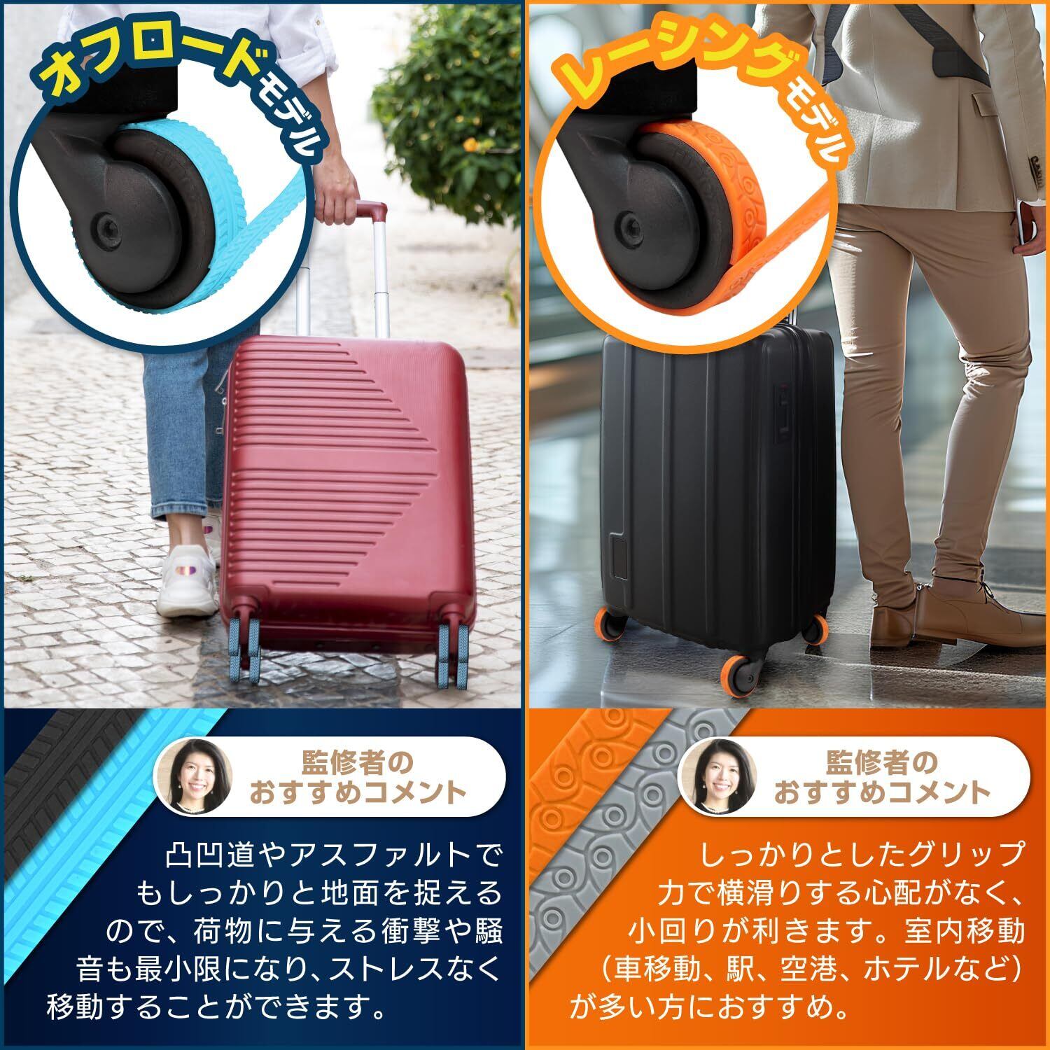 【用途で選べる2タイプ】今回2タイプのキャスターカバーを販売! オフロードモデル:凹凸のある地面でも衝撃や騒音を吸収します レーシングモデル:しっかりとしたグリップ力で小回りが利きます。