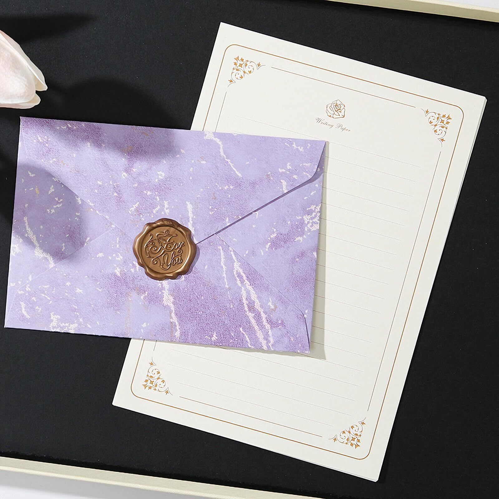レターセット 手紙セット マーブル柄 封筒6枚 封緘シール6枚 便箋20枚 ラブレター メッセージカード ワックスシール付き 結婚式 誕生日 お祝い (パープル)