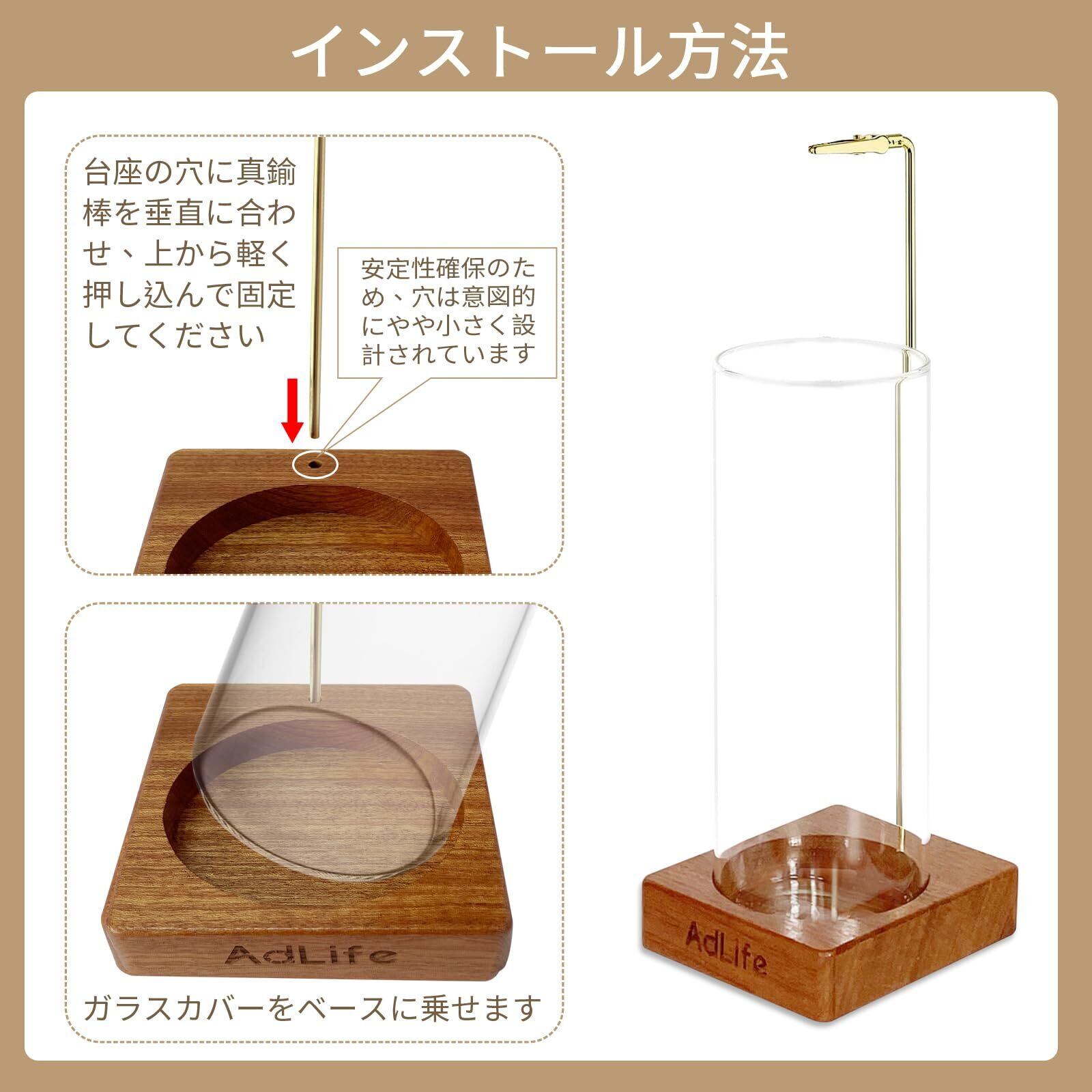 【特価商品】AdLife お香立て 灰がこぼれない 吊り下げ式 線香立て 香炉 ガラス 真鍮 木製台座 おしゃれ 可愛い インテリア 香道 仏壇 寝室 書斎 玄関 ヨガ 瞑想 贈り物に (円形)