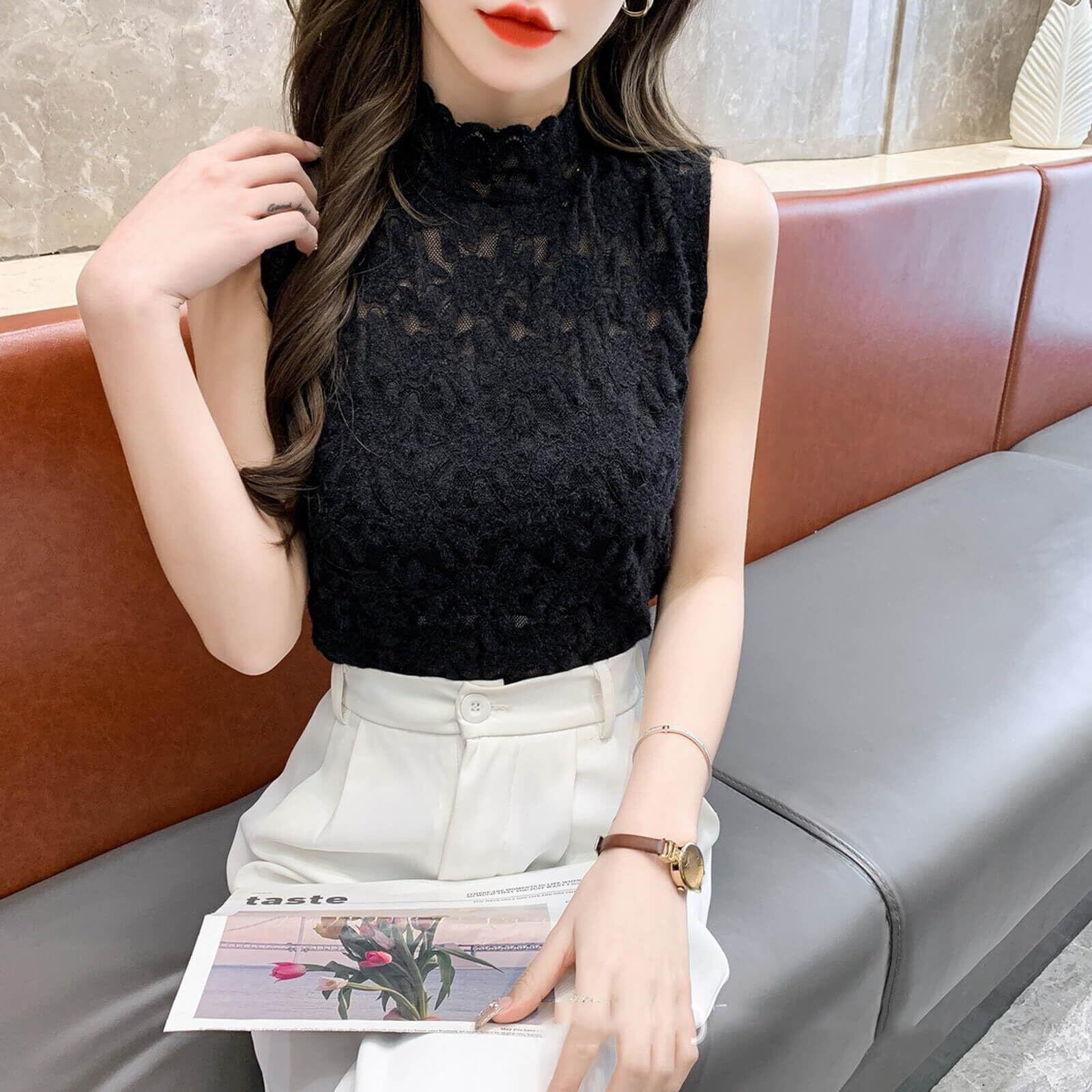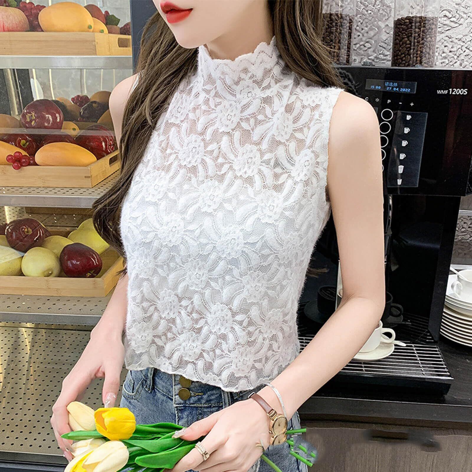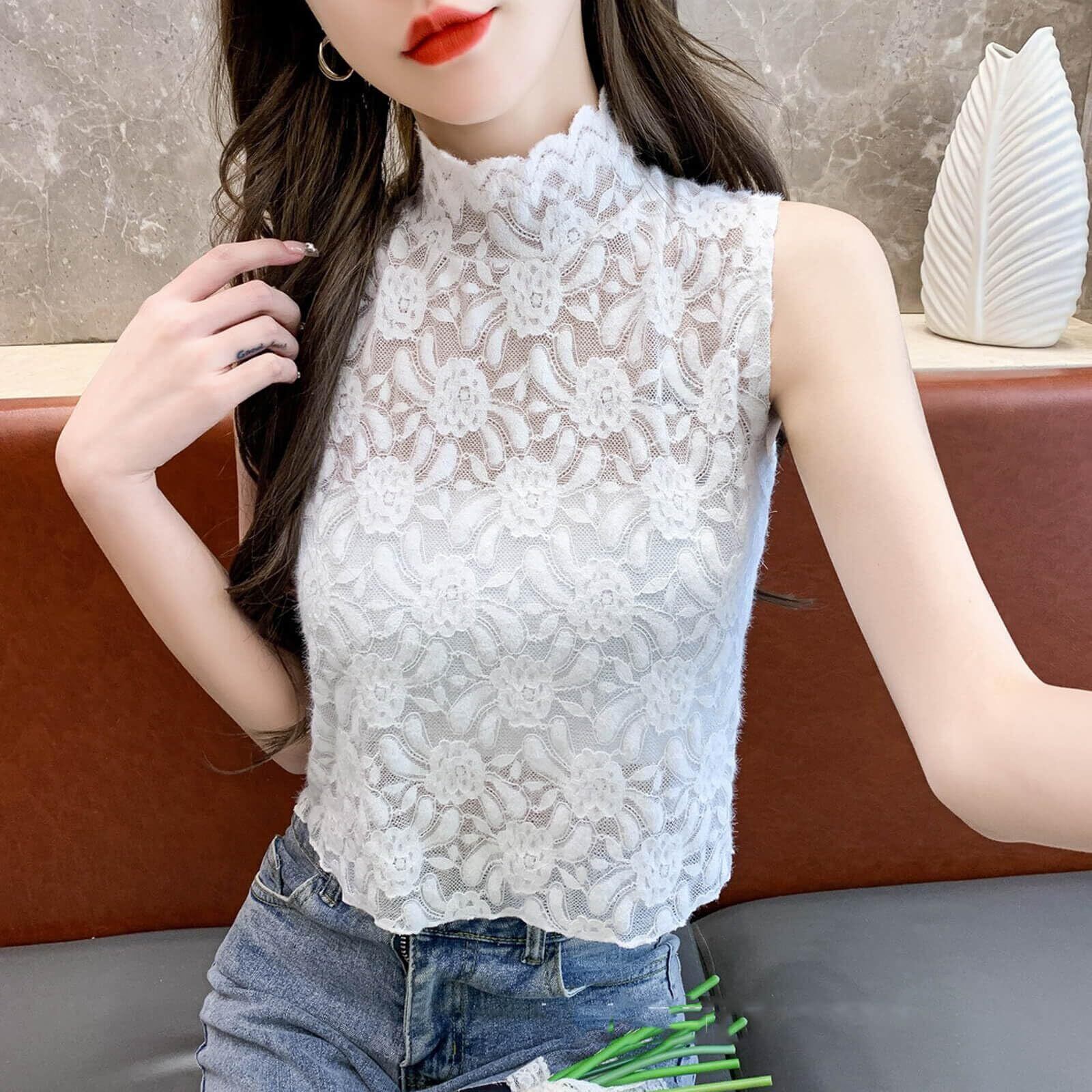 着るだけで上品で華やかな印象に早変わり、総レースのノースリーブインナーシャツです。着丈が短いのでつけ襟のようにもお使いいただけます。