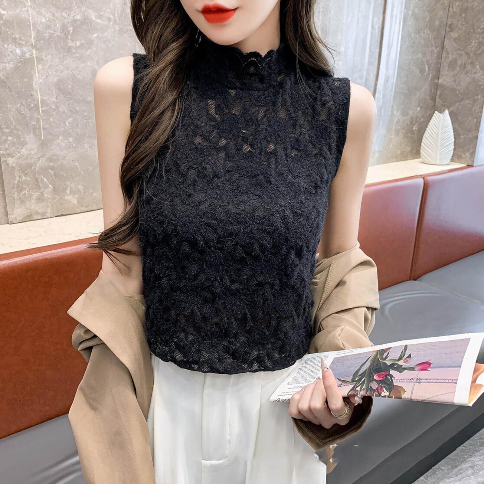 【特価セール】[fourfivesixはる] レース タンクトップ インナー ハイネック レイヤード ショート丈 ノースリーブ 短め花柄 レースインナー レディース 重ね着風 薄手 透け感 首元綺麗 フォーマルネックカバー インナーウェア