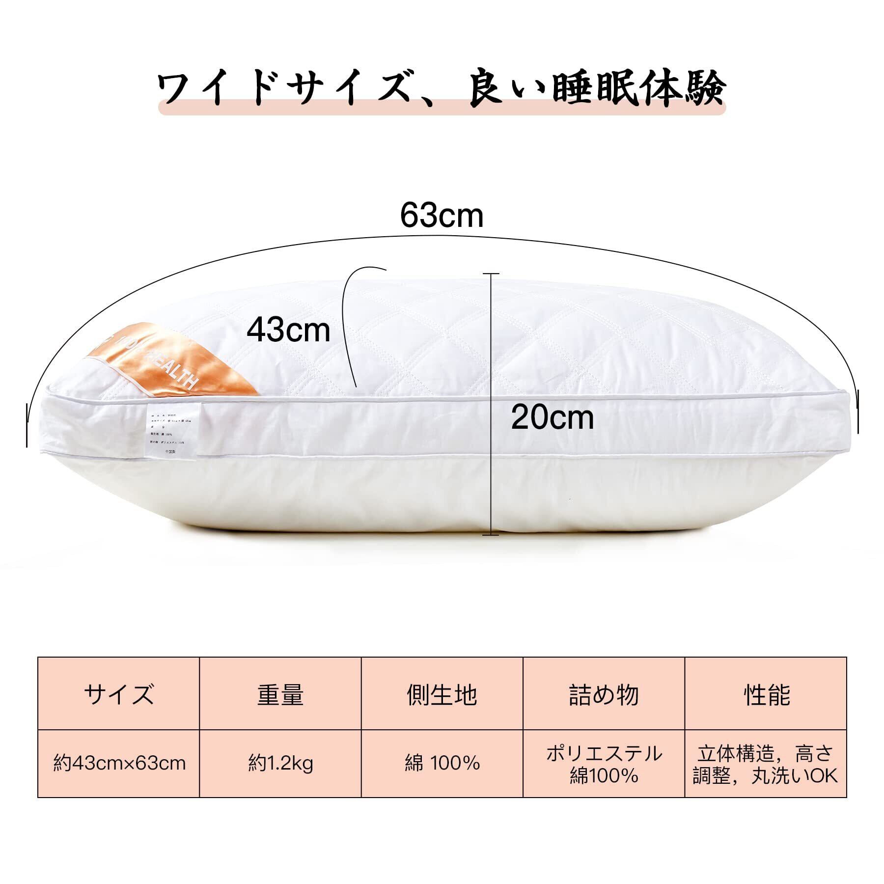 AYO 枕 まくら 高級ホテル仕様 高反発枕 横向き対応 丸洗い可能 立体構造43x63cm ホワイト(63*43*20cm)