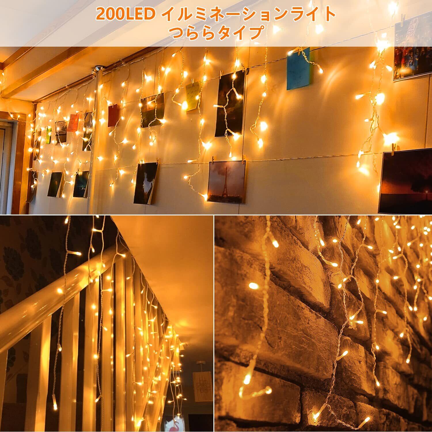 ◆【アイシクルライト】つららライトは横に伸びたコードから不規則な長さでLEDライトが垂れ下がっているのが特徴です。その特徴を活かして、建物の軒下によく使用されております。コードを伸ばすと、LED電球がつらら状に垂れ下がり真冬の氷柱が輝いているような演出が可能になります。仕様: LED配列: 3-7-4-6, 40列 ; 電球数:200球;コード間隔:16cm;発光色: ウォームホワイト