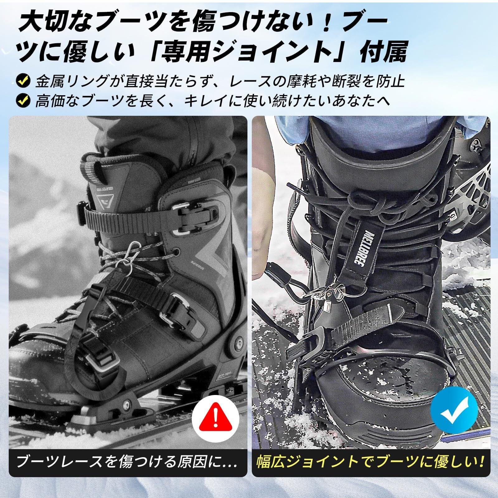 【BOA靴にもやさしくフィット】幅広ベルクロが面で支え、ブーツを傷めにくい。穴あけ不要でレンタル靴や複数ブーツでも使いやすい。