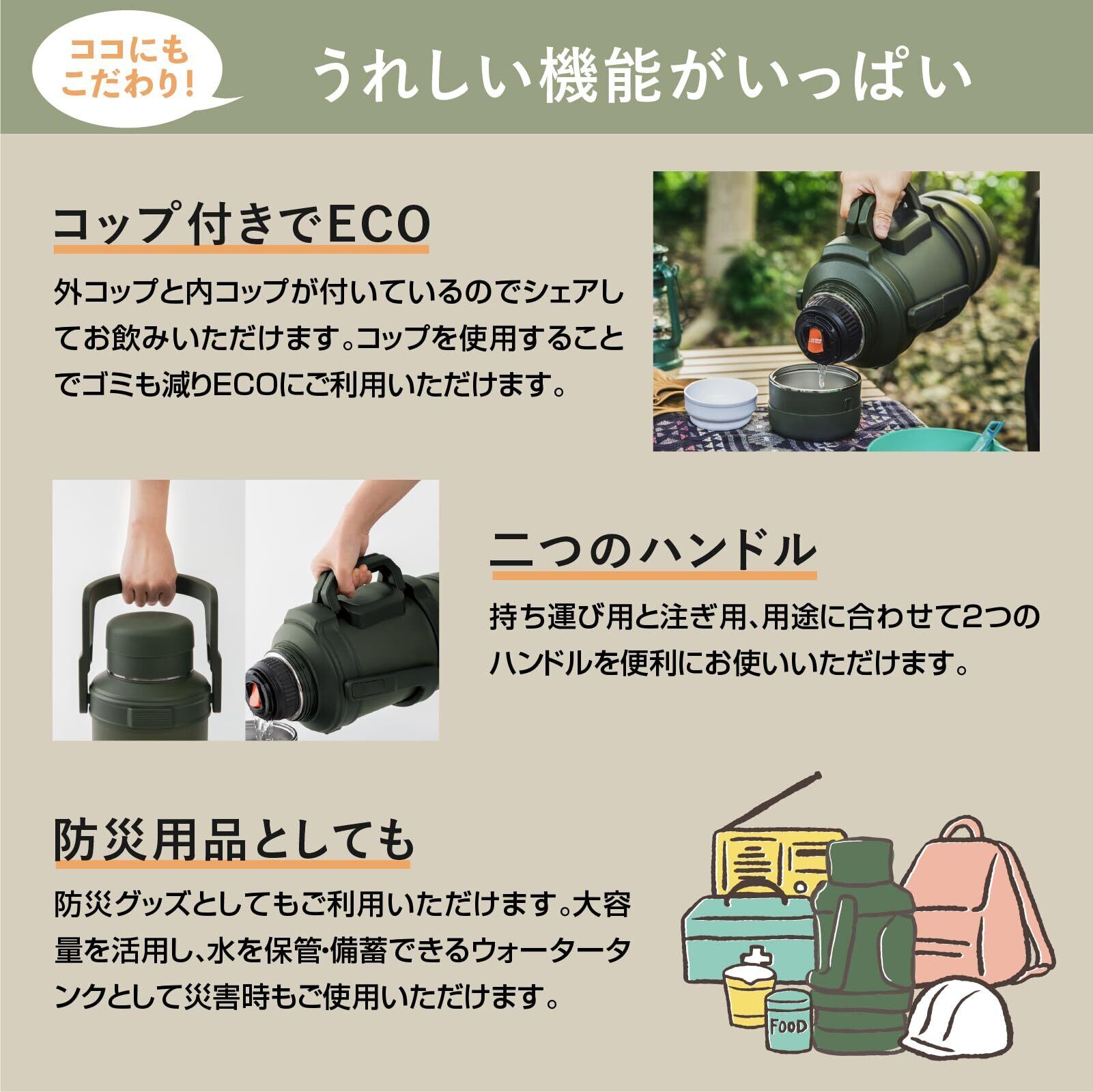 ステンレス真空断熱構造でしっかり外気温を遮断、保温と保冷効果に優れています。●特大容量で、みんなで分け合って飲める。