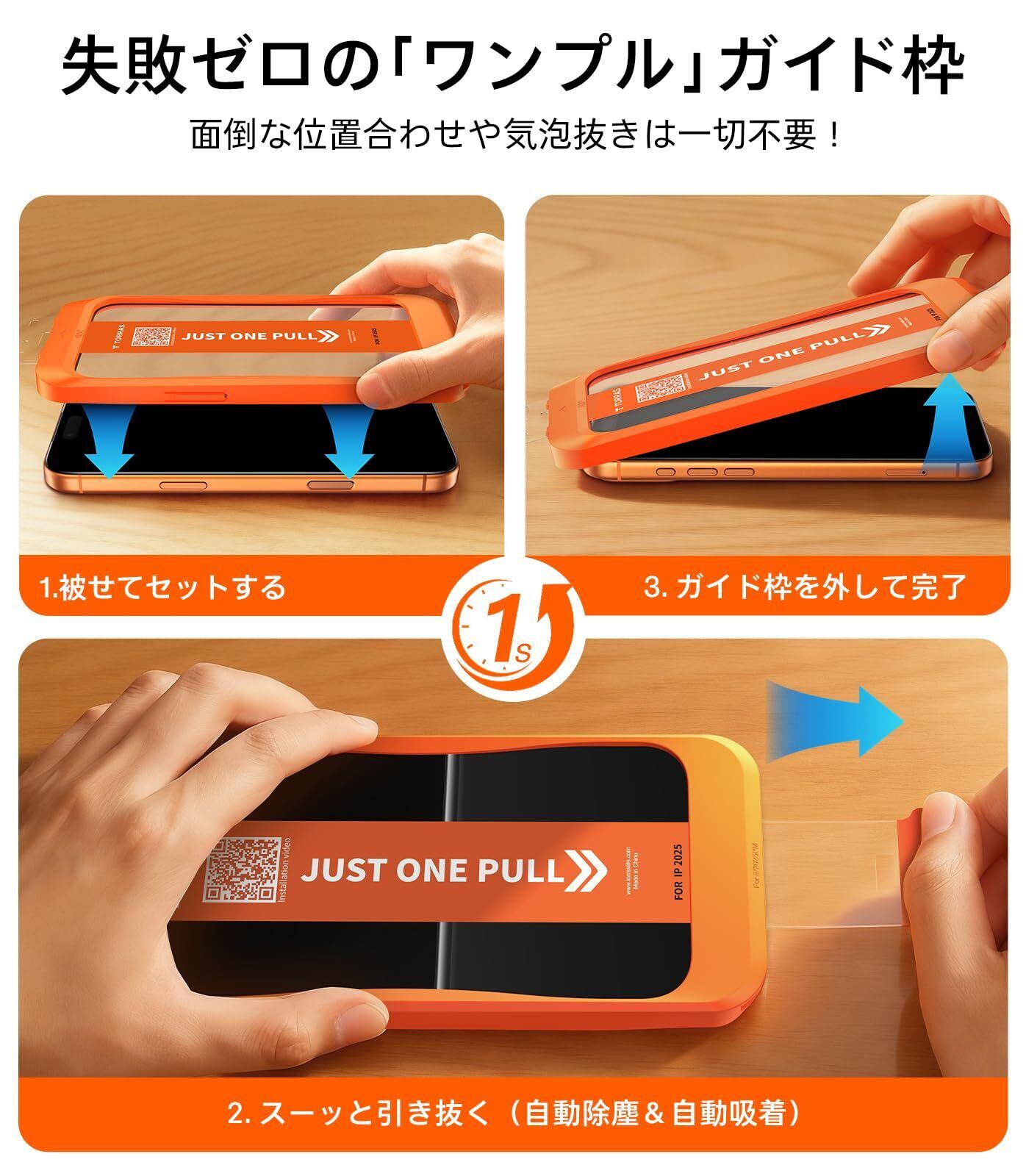 【画期的な「ワンプル(Just One Pull)ガイド枠」で一発貼り・プロ級の仕上がりを誰でも】TORRASの「ワンプル(Just One Pull)ガイド枠」をスマホにセットして一度引くだけで、位置合わせから貼り付けまで完了。CNC精度に基づくフレームガイドと進化した自動除塵システムが屋内外の微細な埃を素早く吸着し、ほぼ0気泡・0ズレの美しい仕上がりを実現。貼り直しやショップでの貼付代行が不要になり、交換コストを大幅に削減。(ご注意:模倣品の粗悪なフレームは角が鋭く表面も荒いため、装着時に本体の縁を擦り傷つける恐れがあります。一方、ワンプル(Just One Pull)ガイド枠は、エッジが平滑に面取りされており、本体に余計な負担をかけずスムーズに装着可能です。仕上げもなめらかで、装着時の引っかかりや小傷を防ぎ、iPhone 16e本体の美しさを長く保ちます)